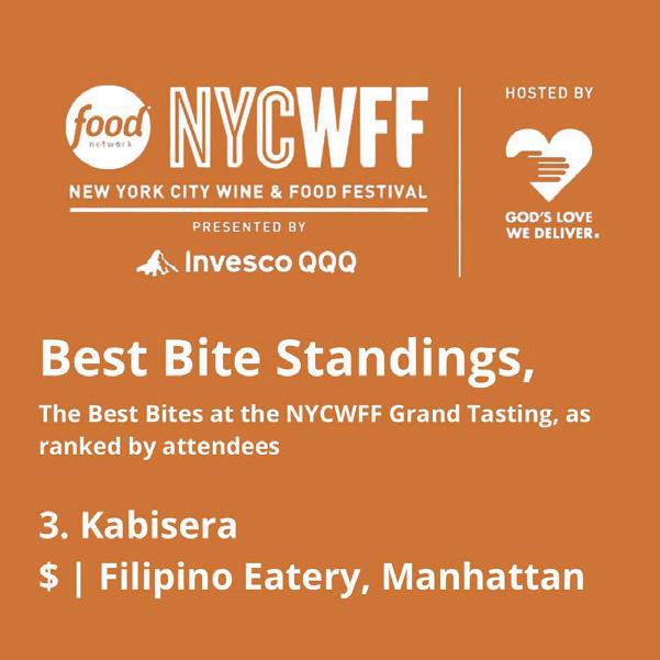vid Ludwigson, President & CEO. “Through NYCWFF, we reach new volunteers, clients, and supporters, furthering our mission to provide life-sustaining meals and nutrition education to New Yorkers at no cost, full of love.” As Kabisera NYC celebrates this honor, Chef Augee and Chef Earl continue their mission to share Filipino cuisine and culture through their food.