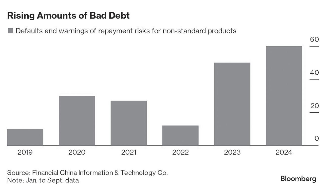 While there is no official tally of the size of the sector, analysts estimate it to be around $800 billion. In the first nine months of this year, 60 non-standard products tied to LGFVs have defaulted or warned of repayment risks, up