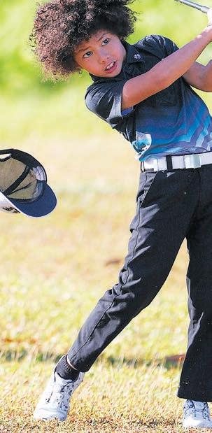 In the 36-hole boys’ 7-10 bracket, Halo Pangilinan toughed it out in the blazing heat to card an 85, edging ahead of Isonn Angheng and Zach Guico, who matched 87s, by two shots.