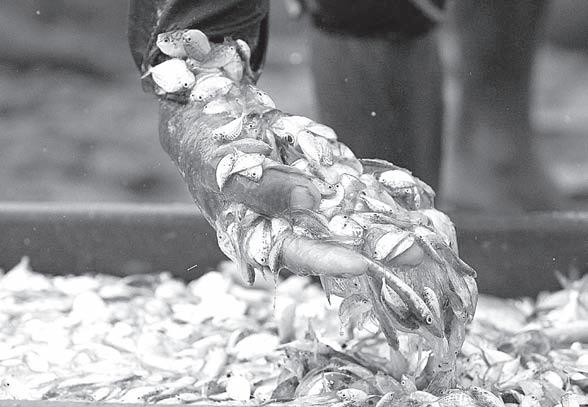 fisherman inspects fish caught using the beach seine method at the coastal waters off Tanauan,