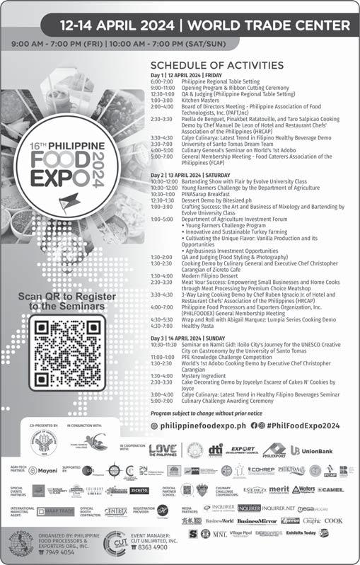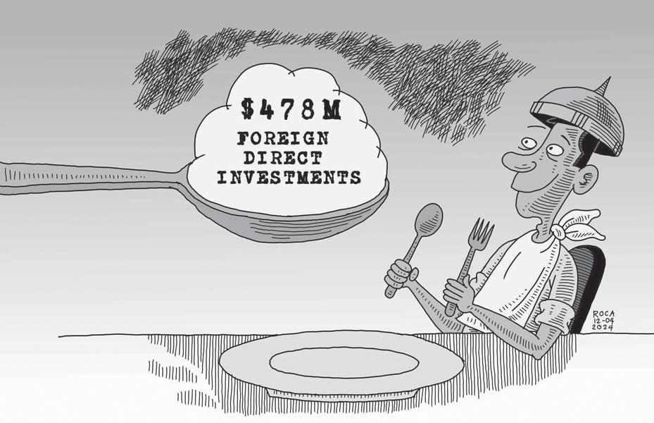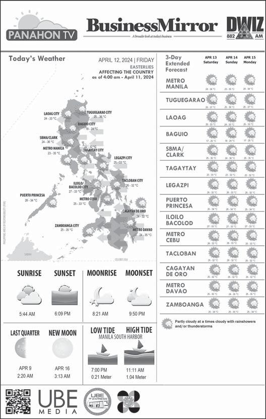 PESO EXCHANGE RATES US 56.5540 JAPAN 0.3697 UK 70.9131 HK 7.2184 CHINA 7.8173 SINGAPORE 41.7897 AUSTRALIA 36.8280 EU 60.7729 KOREA 0.0415 SAUDI ARABIA 15.0779 Source BSP (April 11, 2024) FEB EXPORT EARNINGS UP 15.7%, A 16-MO HIGH A broader look at today’s business www.businessmirror.com.ph Friday, April 12, 2024 Vol. 19 No. 178 P. nationwide | sections pages | 7 DAYS A WEEK BusinessMirror 2006 National Newspaper of the Year 2011 National Newspaper of the Year 2013 Business Newspaper of the Year 2017 Business Newspaper of the Year 2019 Business Newspaper of the Year 2021 Pro Patria Award PHILIPPINE STATISTICS AUTHORITY 2018 Data Champion EJAP JOURNALISM AWARDS BUSINESS NEWS SOURCE OF THE YEAR 2017, 2018, 2019, 2020, 2021 DEPARTMENT OF SCIENCE AND TECHNOLOGY 2018 BANTOG MEDIA AWARDS See “Jobless,” A See “Feb,” A JOBLESS RATE SLOWS BUT GOVT FLAGS EXIT OF WOMEN, YOUTH See “High,” A RICE RESILIENCE Despite the sweltering summer heat, a resident of Barangay Burgos in Pakil, Laguna, checks on a palay farm in Estaca port, ready for harvest in the next three months, embodying hope for a fruitful yield despite challenging conditions. BERNARD TESTA By Cai U. Ordinario @caiordinario A