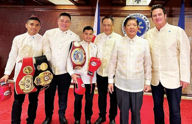 PRESIDENT Ferdinand “Bongbong” Marcos Jr. (fifth from left) receives in Malacañang (from left) world champion Marlon Tapales, Mike Pelayo, world champion Melvin Jerusalem, Jerry Pelayo and international matchmaker Sean Gibbons.