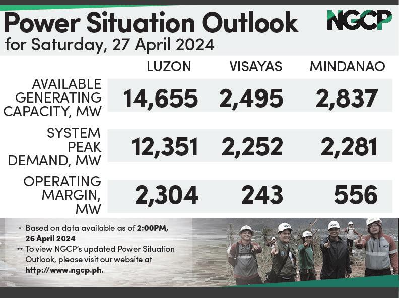 The Department of Energy (DOE) is expecting more yellow alerts and possibly red alerts in the next few weeks until middle of May. Meanwhile, the NGCP conducted this month its annual blackout drills to further sharpen its plans and improve grid reliability and security in preparation for contingencies, including massive power outages or disturbances.