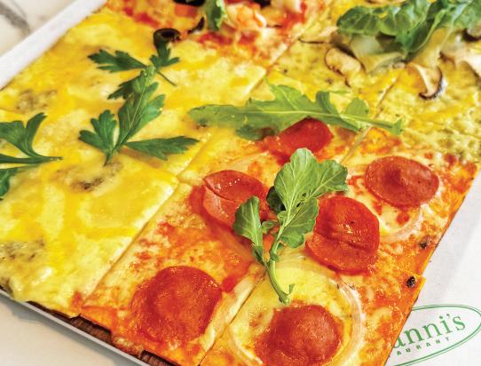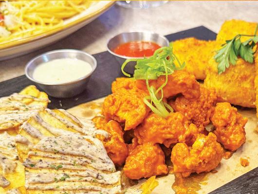 Trio: potato crisps drenched in rich truffle sauce, fried mozzarella with marinara sauce, and buffalo bites paired with bleu cheese dressing. Keep the flavor train rolling with the Truffle Bacon and Mushrooms flatbread—packed with taste yet light enough to leave room for more.