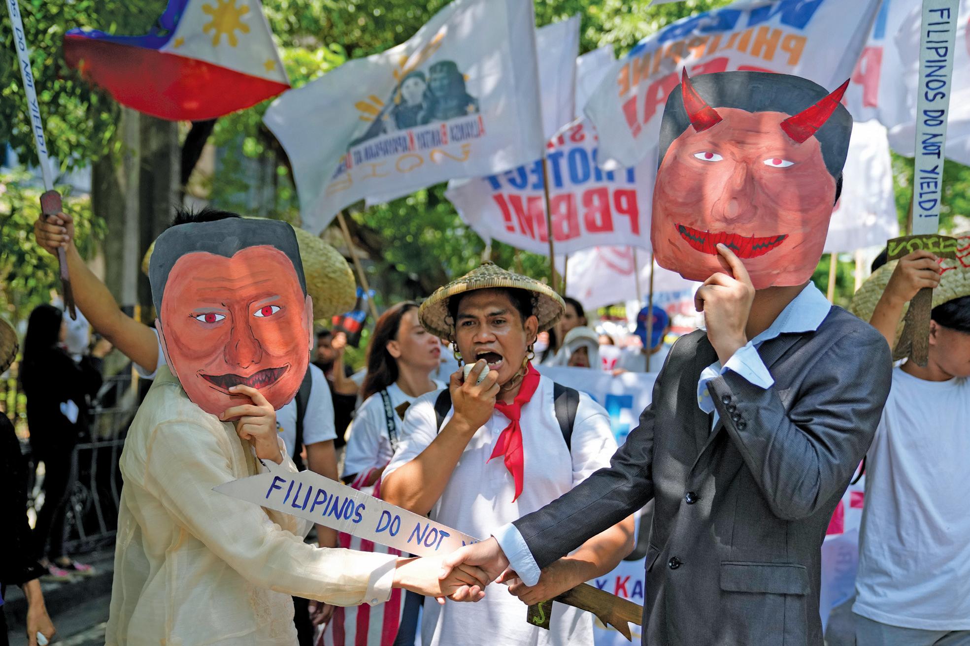 PROTESTERS with masks depicting former Philippine President Rodrigo Duterte, left, and Chinese President Xi Jinping stage a rally outside the Chinese consulate in Makati City on Friday, April 19, 2024. The protesters were calling on the Chinese government to end the alleged harassment of Philippine vessels and fishermen at the disputed South China Sea. AP/AARON FAVILA