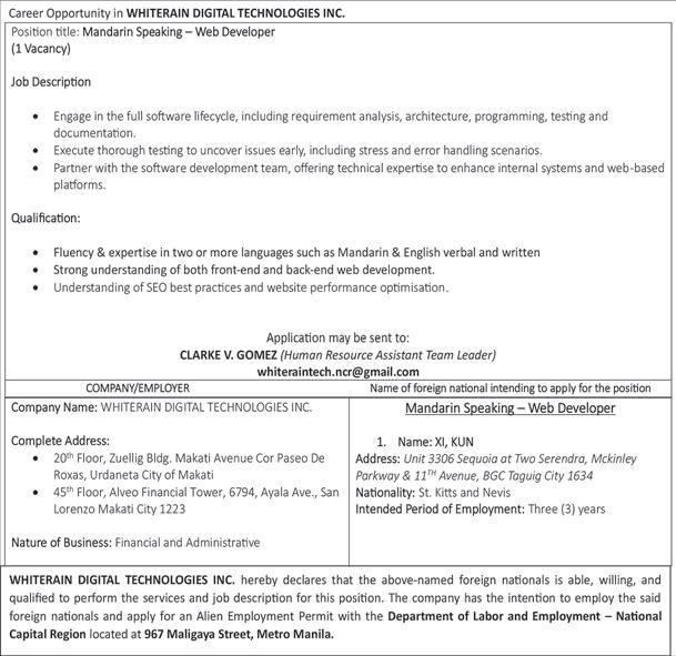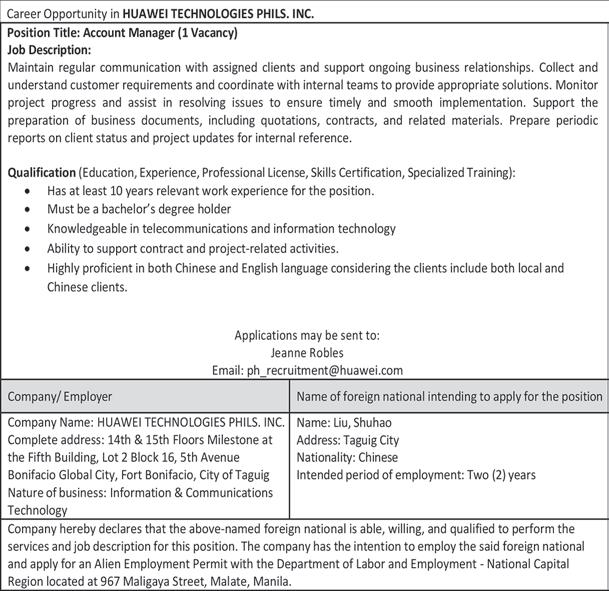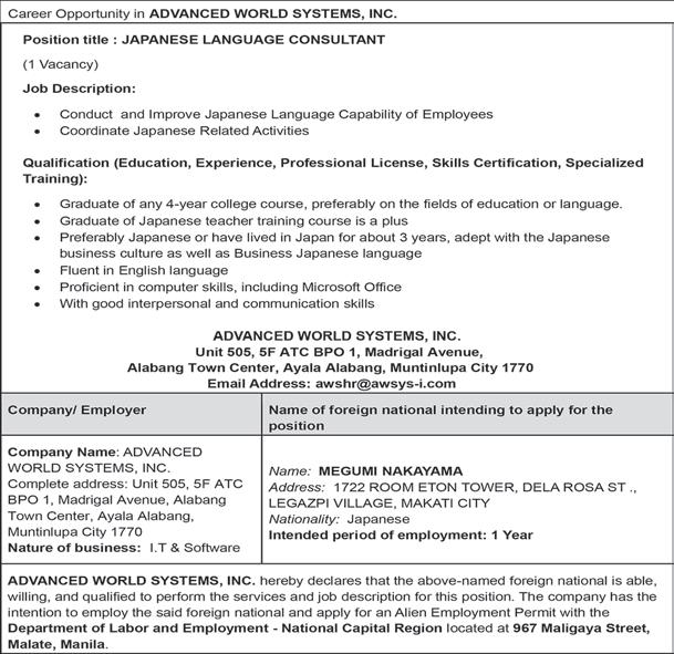 A lso needed are carpenters, foremen, and steelmen for construction; customer service representatives for the business process outsourcing (BPO) sector; and service crew, line cooks, and baristas for hospitality.