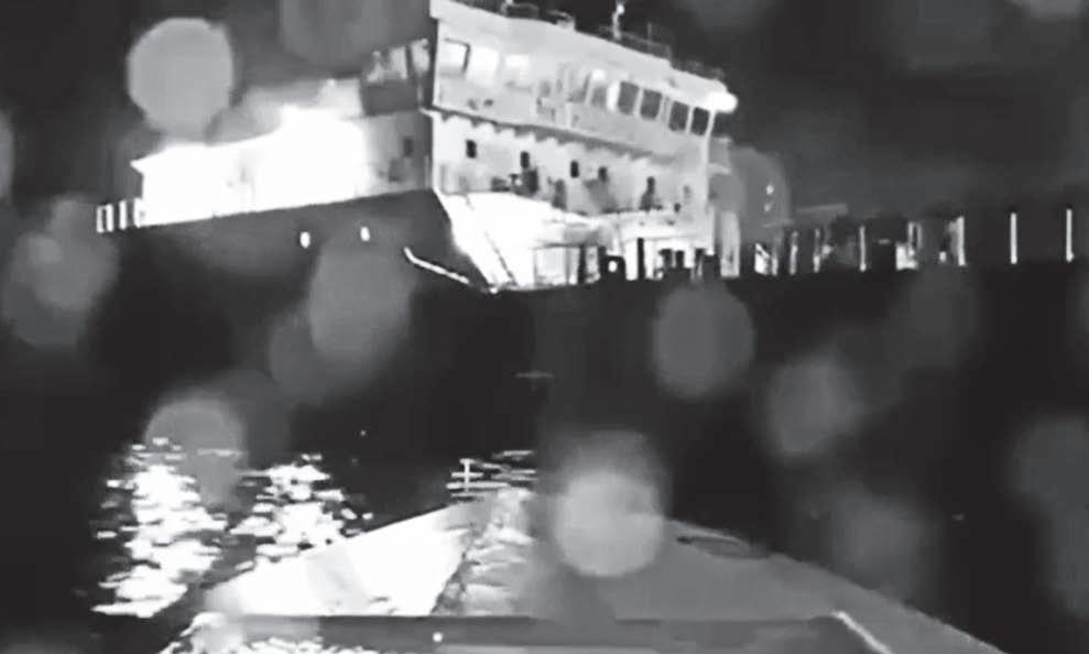 IN this image from video made available on Saturday, August 5, 2023, a seaborne drone approaches a Russian tanker on the Black Sea. Ukrainian drones have hit a Russian tanker in the Black Sea near Crimea, according to Russian officials. The strike was the second sea attack involving drones in one day, after Ukraine said its sea drones also struck a major Russian port on Friday. AP