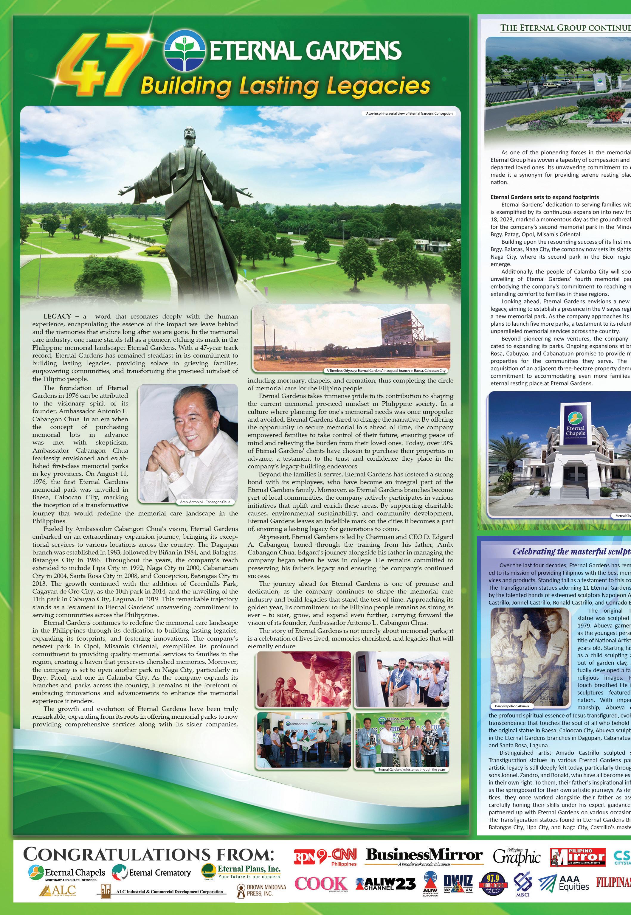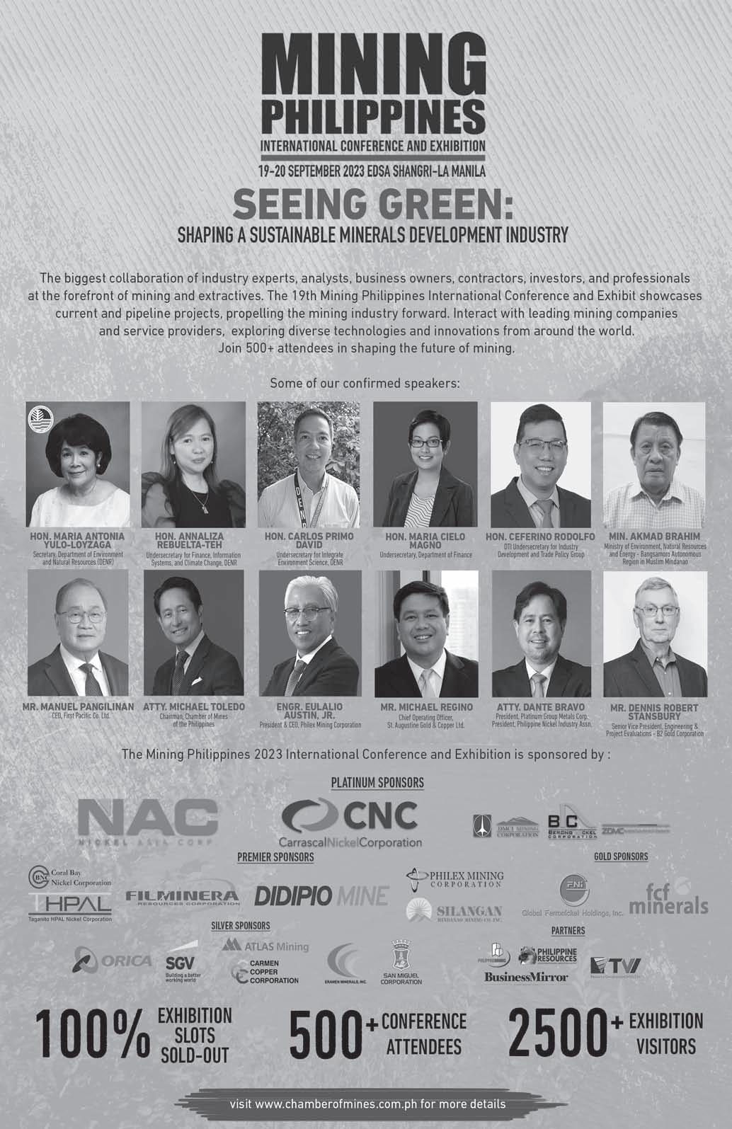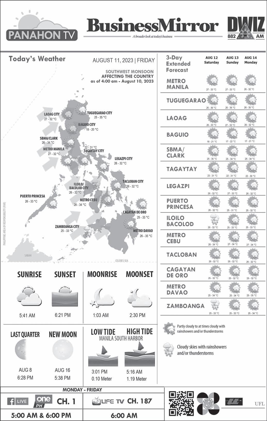 PESO E xchangE ratES n US 56.2980 n jaPan 0.3918 n UK 71.6223 n hK 7.1985 n chIna 7.8068 n SIngaP OrE 41.8231 n aUStralIa 36.7626 n EU 61.7983 n KOrE a 0.0429 n SaUDI arabIa 15.0156 Source: BSP (August 10, 2023) INTEREST RATES CITED IN Q2 GROWTH SLOWING A broader look at today’s business www.businessmirror.com.ph n Friday, August 11, 2023 Vol. 18 No. 298 P25.00 nationwide | 2 sections 32 pages | 7 dAys A week BusinessMirror ROTARY CLUB OF MANILA JOURNALISM AWARDS 2006 National Newspaper of the Year 2011 National Newspaper of the Year 2013 Business Newspaper of the Year 2017 Business Newspaper of the Year 2019 Business Newspaper of the Year 2021 Pro Patria Award 2018 Data Champion EJAP JOURNALISM AWARDS BUSINESS NEWS SOURCE OF THE YEAR (2017, 2018, 2019, 2020, 2021) DEPARTMENT OF SCIENCE AND TECHNOLOGY 2018 BANTOG MEDIA AWARDS 4.3% GDP growth in Q2 slowest in 2 years See “GDP,” A2
