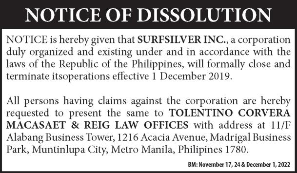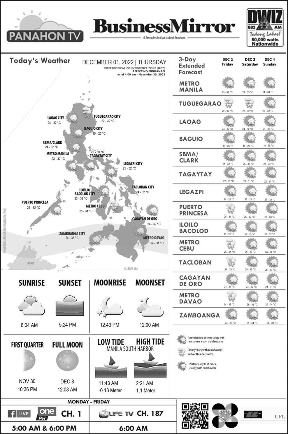 STUDY FLAGS RISK OF WORKER DEVICES IN HYBRID WORK PESO EXCHANGE RATES US 56.7960 ■ JAPAN 0.4088 ■ UK 67.9337 ■ HK 7.2687 ■ SINGAPORE 41.1834 ■ AUSTRALIA 37.7580 ■ SAUDI ARABIA 15.1174 ■ EU 58.7327 ■ KOREA 0.0424 ■ CHINA 7.8811 Source BSP (November 29, 2022) S “BSP,” A BusinessMirror A broader look at today’s business www.businessmirror.com.ph P. | | 7 DAYS A WEEK ■ Thursday, December 1, 2022 Vol. 18 No. 50 2006 National Newspaper of the Year 2011 National Newspaper of the Year 2013 Business Newspaper of the Year 2017 Business Newspaper of the Year 2019 Business Newspaper of the Year 2021 Pro Patria Award PHILIPPINE STATISTICS AUTHORITY 2018 Data Champion EJAP JOURNALISM AWARDS BUSINESS NEWS SOURCE OF THE YEAR (2017, 2018, 2019, 2020) DEPARTMENT OF SCIENCE AND TECHNOLOGY 2018 BANTOG MEDIA AWARDS BSP: NOV INFLATION MAY HAVE INCREASED TO 8.2% HEROES PARK Visitors walk past the monument to Filipino revolutionary Andrés Bonifacio and the Philippine Revolution in Ermita, Manila. Also known as the Kartilya ng Katipunan or Heroes Park, the monument was designed by sculptor Eduardo Castrillo and unveiled in 1998. In 2019 the plaza was rehabilitated upon orders of then Manila Mayor Isko Moreno. November 30 marks the 159th birth anniversary of “The Father of the Philippine Revolution.” ROY DOMINGO S “S,” A Stocks