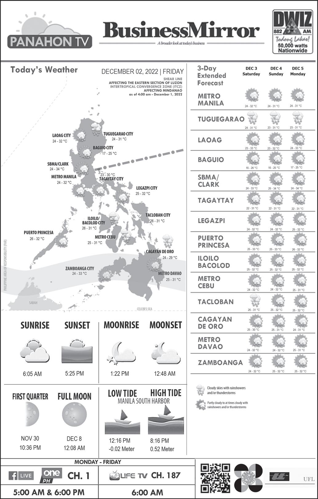 PESO E xchangE ratES n US 56.5980 n jaPan 0.4101 n UK 68.2515 n hK 7.2471 n chIna 7.9795 n SIngaP OrE 41.5764 n aUStralIa 38.4074 n EU 58.9129 n KOrE a 0.0435 n SaUDI arabIa 15.0567 Source: BSP (December 1, 2022) hOUSE PanEl clEarS P250-b MaharlIK a WEalth FUnD bIll See “ILO” A2 See “Foreign,” A2 ILO: REAL GLOBAL WAGE GROWTH DOWN SHARPLY A broader look at today’s business www.businessmirror.com.ph n Friday, December 2, 2022 Vol. 18 No. 51 P25.00 nationwide | 2 sections 28 pages | 7 Days a week BusinessMirror ROTARY CLUB OF MANILA JOURNALISM AWARDS 2006 National Newspaper of the Year 2011 National Newspaper of the Year 2013 Business Newspaper of the Year 2017 Business Newspaper of the Year 2019 Business Newspaper of the Year 2021 Pro Patria Award PHILIPPINE STATISTICS AUTHORITY 2018 Data Champion EJAP JOURNALISM AWARDS BUSINESS NEWS SOURCE OF THE YEAR (2017, 2018, 2019, 2020, 2021) DEPARTMENT OF SCIENCE AND TECHNOLOGY 2018 BANTOG MEDIA AWARDS See “House,” A2