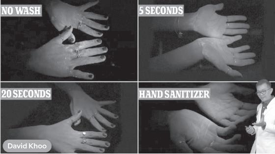 DaviD Khoo, Principal Scientist of health and hygiene institute shows the difference of washing for 20 seconds versus five or none at all.