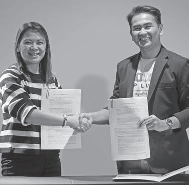 PHILIPPINE National Volleyball Federation (PNVF) president Ramon “Tats” Suzara (seated left) and Club Laiya consultant Patrick “Pato” Gregorio (seated right) seal the partnership. Joining them are (standing, from left) PNVF vice president Dr. Arnel Hajan, national athletes Alnakran Abdilla, Jaron Requinton, Bernadeth Pons, Grydelle Joanice Matibag and Khylem Harl Progella, PNVF secretarygeneral Donaldo Caringal and Landco Pacific Corp. VP for Sales and Marketing Gerard Peñaflor.