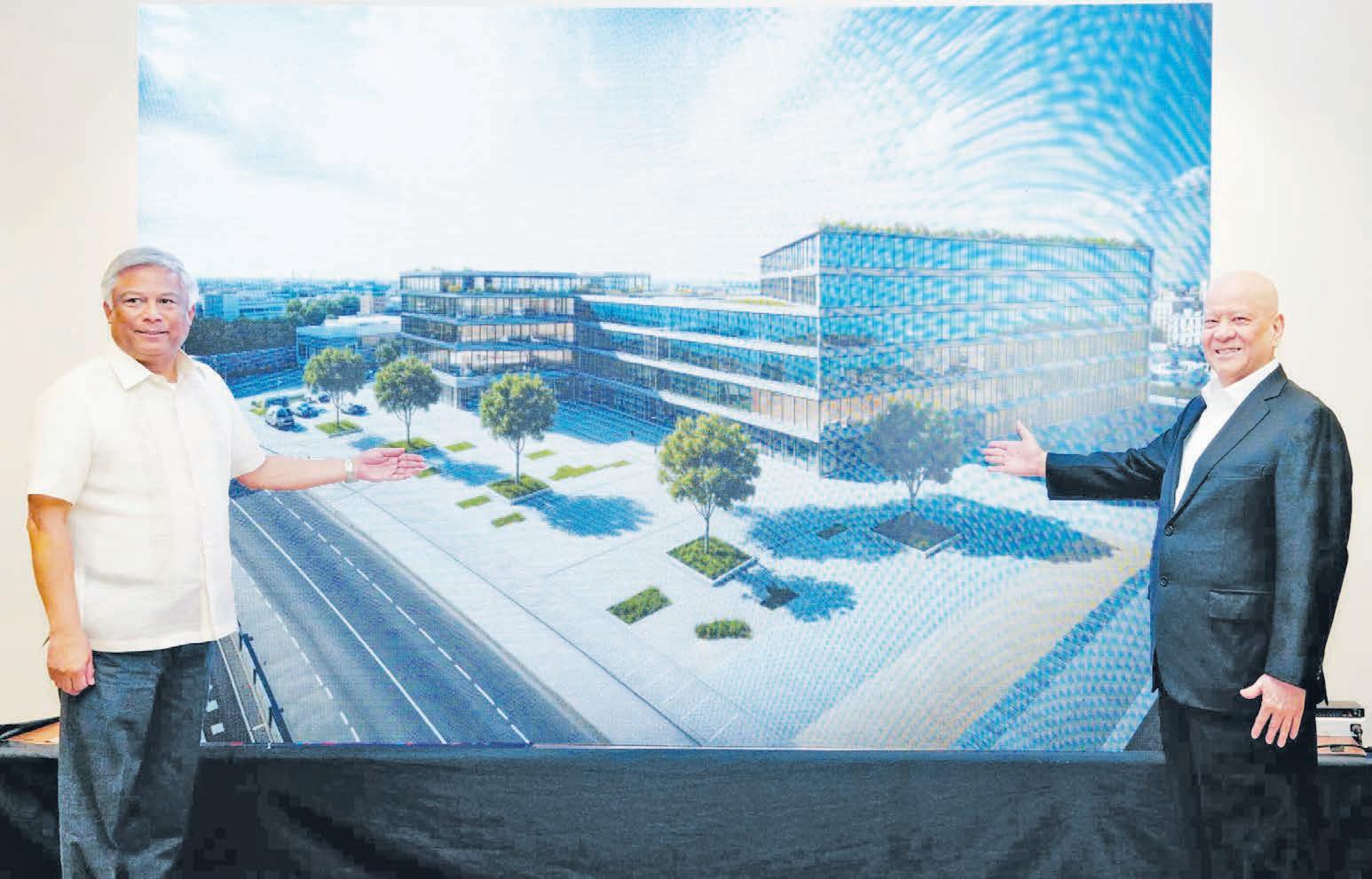 PAGCOR, SMC IN NAYONG PILIPINO COMPLEX Philippine Amusement and Gaming Corporation (Pagcor) Chairman and CEO Alejandro H. Tengco (left) and San Miguel Corporation (SMC) Chairman Ramon S. Ang present the artist’s perspective of Pagcor’s new corporate office, set to rise on a two-hectare site within the Nayong Pilipino Complex in Pasay City. StoryonB3 PHOTO COURTESY OF PAGCOR