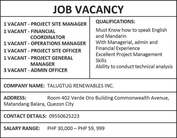 W hile BOI still expects renewable energy projects to occupy a huge chunk of the investment pledges pie next year, Dormiendo noted: “But we’re beefing up our promotion initiatives to be able to register manufacturing and other sectors such as semiconductors. Hopefully we’ll be able to bring in companies that are into mineral processing, those highvalue manufacturing.”