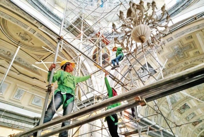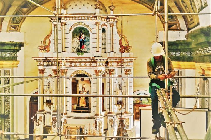 RESTORATION worker readies scaffolding inside Apalit Church.
