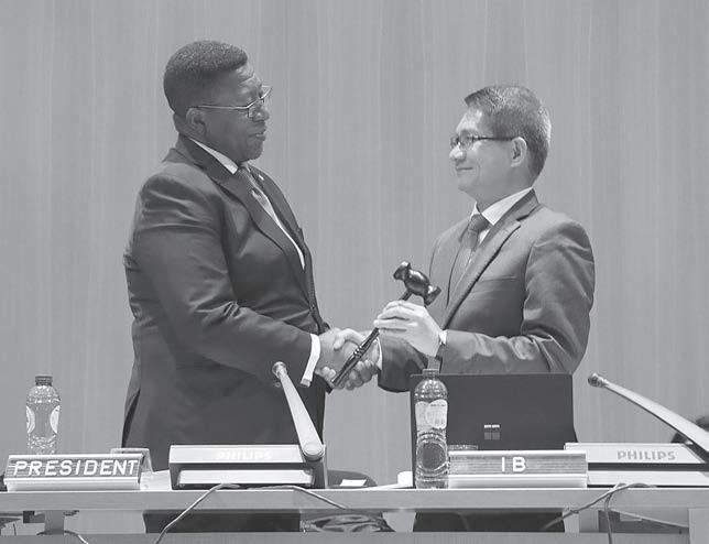 AMBASSADOR Malaya (right) receives the PCA gavel from the outgoing Administrative Council president and South African envoy to the Netherlands.