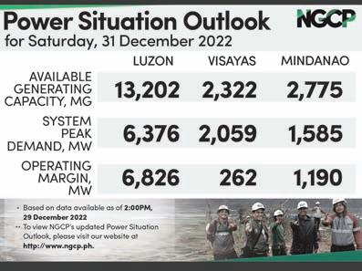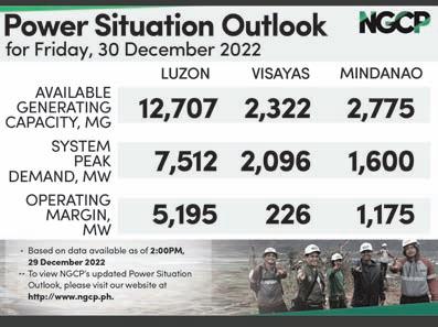 PESO E xchangE ratES n US 56.1200 n jaPan 0.4174 n UK 67.4394 n hK 7.1996 n chIna 8.0372 n SIngaP OrE 41.5796 n aUStralIa 37.8024 n EU 59.5545 n KOrE a 0.0441 n SaUDI arabIa 14.9335 Source: BSP (December 29, 2022) See “PHL,” A2 BSP: DEC INFLATION RATE COULD HIT UP TO 8.6% A broader look at today’s business www.businessmirror.com.ph n Friday-Saturday, December 30-31, 2022 Vol. 18 No. 77 P25.00 nationwide | 2 sections 26 pages | 7 DayS a week BusinessMirror ROTARY CLUB OF MANILA JOURNALISM AWARDS 2006 National Newspaper of the Year 2011 National Newspaper of the Year 2013 Business Newspaper of the Year 2017 Business Newspaper of the Year 2019 Business Newspaper of the Year 2021 Pro Patria Award PHILIPPINE STATISTICS AUTHORITY 2018 Data Champion EJAP JOURNALISM AWARDS BUSINESS NEWS SOURCE OF THE YEAR (2017, 2018, 2019, 2020, 2021) DEPARTMENT OF SCIENCE AND TECHNOLOGY 2018 BANTOG MEDIA AWARDS PHL residential prices rise in Q3—BSP data PBBM China trip seen to yield 10-14 bilateral deals PBBM