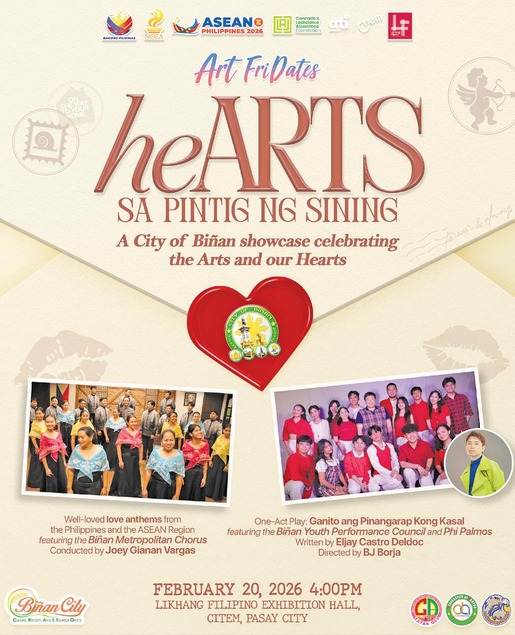On February 20, Biñan will present heARTS: Sa Pintig ng Sining, a tribute to the arts and to the emotional bonds formed through creative expression. The program will feature the Biñan Metropolitan Chorus in a mini-concert of love anthems from the Philippines and ASEAN, celebrating musical heritage and regional unity. Joey Gianan Vargas conducts. It