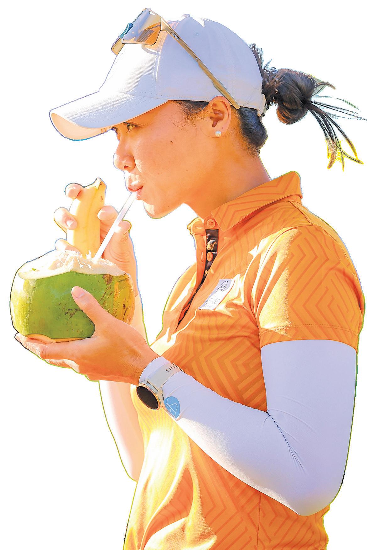 THAILAND’S Nook Sukapan (right) takes a refreshing sip of coconut juice while the Philippines’ Pauline del Rosario (white outfit) and Princess Superal take it all easy in Tuesday’s pro-am. LPGT PHOTO