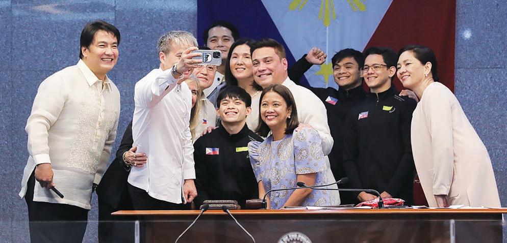HAPPY TOGETHER Senators—(from left) Bong Revilla, Joel Villanueva, Christopher Lawrence “Bong” Go, Robinhood Padilla, Pia Cayetano, Senate President Juan Miguel Zubiri, Nancy Binay and Risa Hontiveros—share a happy moment with world-class gymnast Carlos “Caloy” Yulo and his fellow gymnasts Justine Ace De Leon and Juancho Miguel Besana and Gymnastics Association of the Philippines president Cynthia Carrion-Norton at the Senate on Monday.