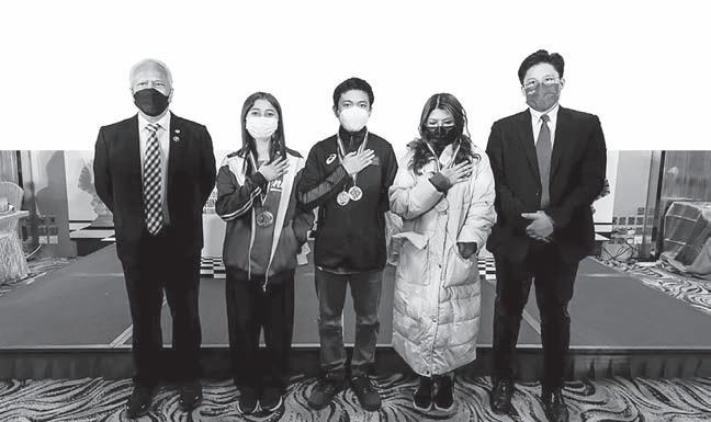 MARK JAY BACOJO (center) with (from left) Chief Arbiter and Hong Kong Chess Federation president and chief arbiter KK Chan, Ayana Nicole Usman and Alexandra Sydney Paez.