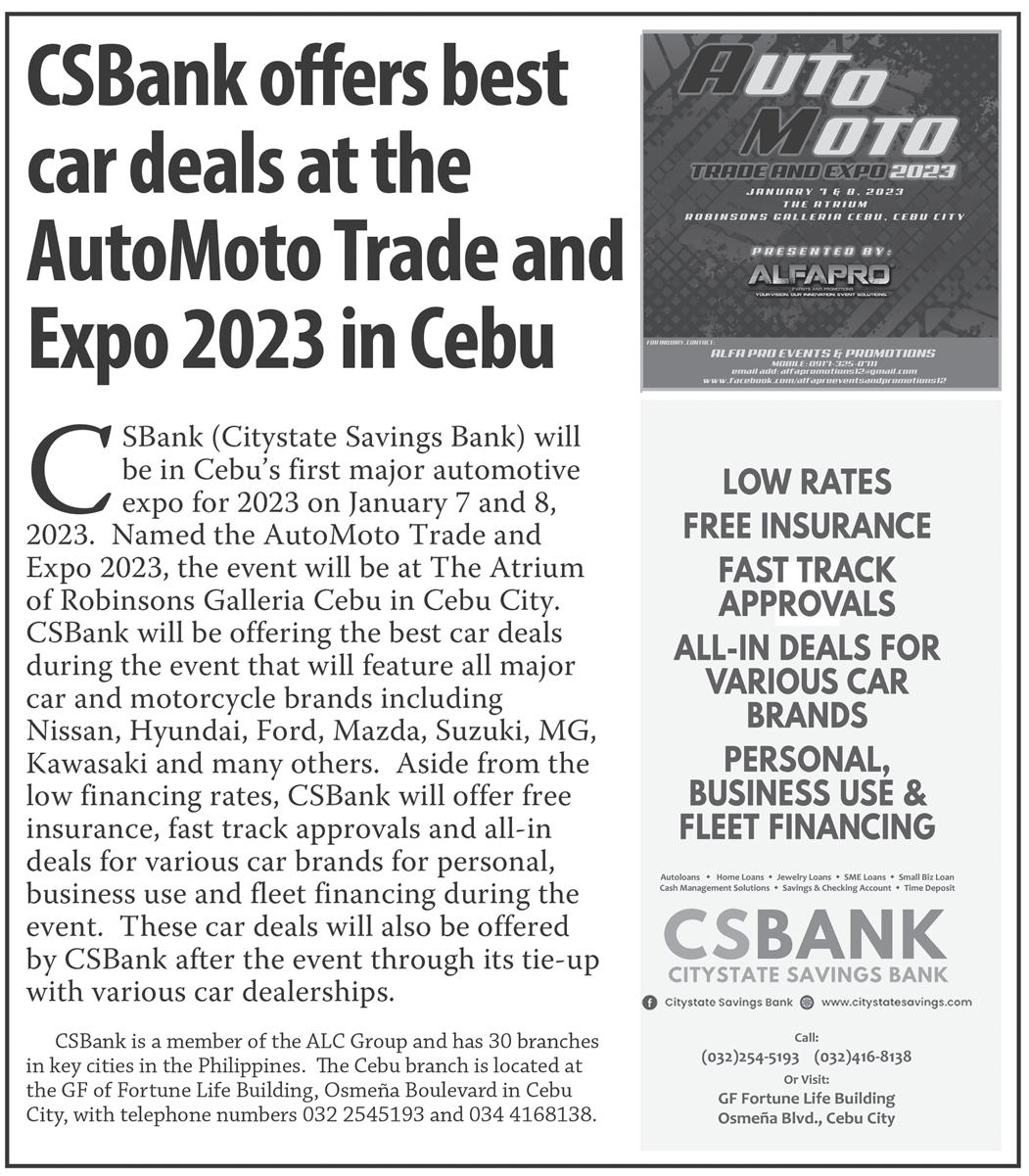 BusinessMirror EJAP JOURNALISM AWARDS BUSINESS NEWS SOURCE OF THE YEAR (2017, 2018, 2019, 2020, 2021) DEPARTMENT OF SCIENCE AND TECHNOLOGY 2018 BANTOG MEDIA AWARDS ROTARY CLUB OF MANILA JOURNALISM AWARDS 2006 National Newspaper of the Year 2011 National Newspaper of the Year 2013 Business Newspaper of the Year 2017 Business Newspaper of the Year 2019 Business Newspaper of the Year 2021 Pro Patria Award PHILIPPINE STATISTICS AUTHORITY 2018 Data Champion www.businessmirror.com.ph n Saturday, January 7, 2023 Vol. 18 No. 84 P25.00 nationwide | 12 pages | 7 DAYS A WEEK
