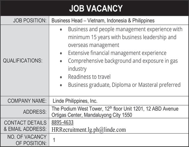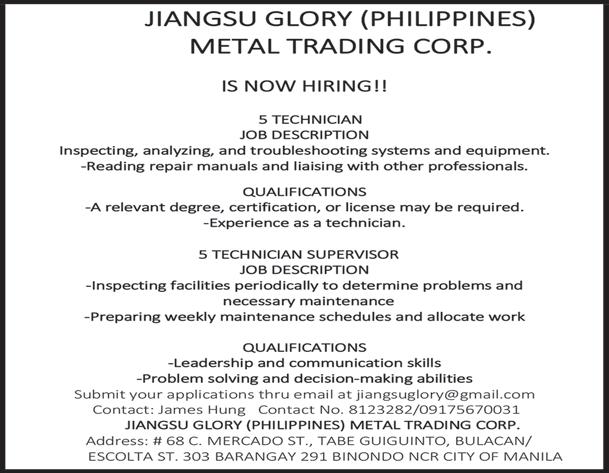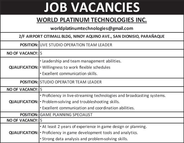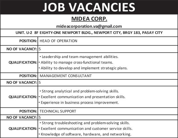 Qualification: College graduate, with previous work experience in a similar role and with excellent technical and communication skills.