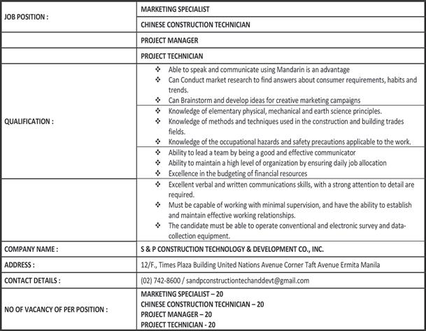 Brief Job Description: Attend client meetings either pre-construction, bidding or project implementation phase. Basic Qualification: With sound working knowledge of and experience with contract documentations, procedures, administration and supervision of construction work. With good communication skills, both verbal and written. Salary Range: Php 150,000 - Php 499,999 NEPC POWER CONSTRUCTION CORP.