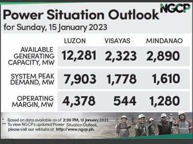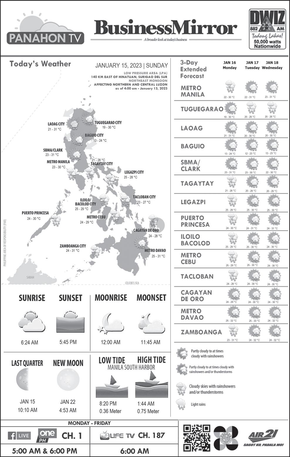 today’s business EJAP JOURNALISM AWARDS BUSINESS NEWS SOURCE OF THE YEAR (2017, 2018, 2019, 2020, 2021) DEPARTMENT OF SCIENCE AND TECHNOLOGY 2018 BANTOG MEDIA AWARDS ROTARY CLUB OF MANILA JOURNALISM AWARDS 2006 National Newspaper of the Year 2011 National Newspaper of the Year 2013 Business Newspaper of the Year 2017 Business Newspaper of the Year 2019 Business Newspaper of the Year 2021 Pro Patria Award PHILIPPINE STATISTICS AUTHORITY 2018 Data Champion www.businessmirror.com.ph n Sunday, January 15, 2023 Vol. 18 No. 92 P25.00 nationwide | 2 sections 12 pages | 7 DAYS A WEEK