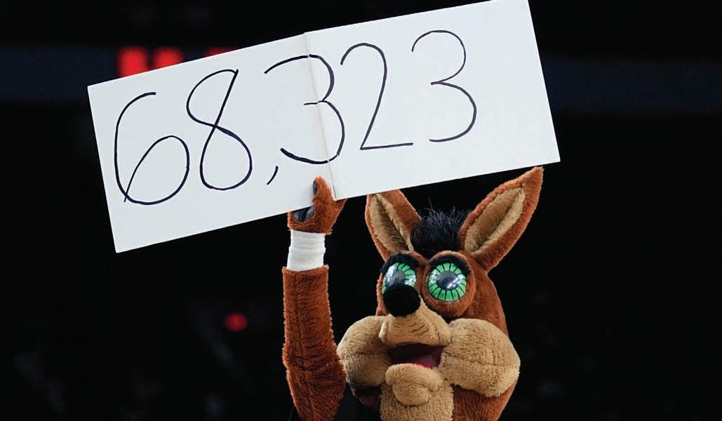 Coyote, the San Antonio Spurs’ mascot, helps announce the attendance during the Spurs-Golden State Warriors game in San Antonio, Friday. The Warriors beat the Spurs, 144-113, before a National Basketball Association-record crowd of 68,323 at the Alamodome. The attendance shattered the previous regularseason record of 62,046 who watched Michael Jordan and the Chicago Bulls play the Atlanta Hawks at the Georgia Dome on March 27, 1998. AP
