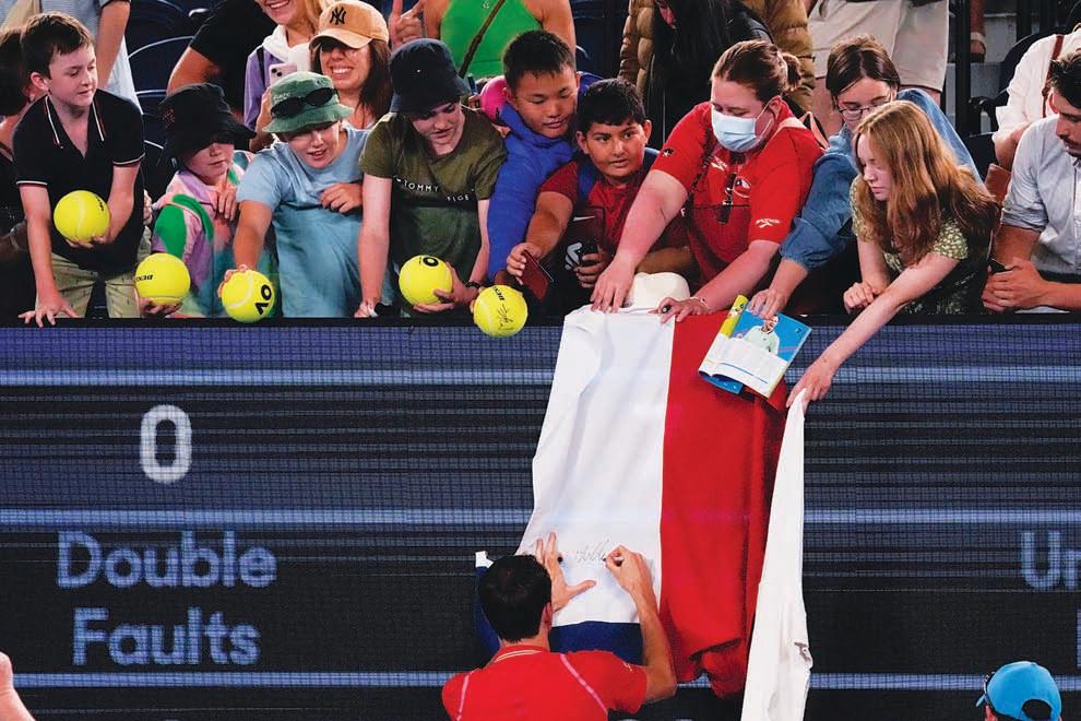 DANIEL MEDVEDEV autographs a Russian flag after defeating Marcos Giron of the US in the first round on Monday. AP