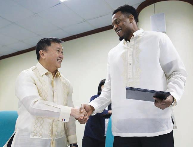 SEN. Francis “Tol” Tolentino congratulates Justin Donta Brownlee after he takes his oath of allegiance to the Republic of the Philippines in a special ceremony at the Senate of the Philippines on Monday.