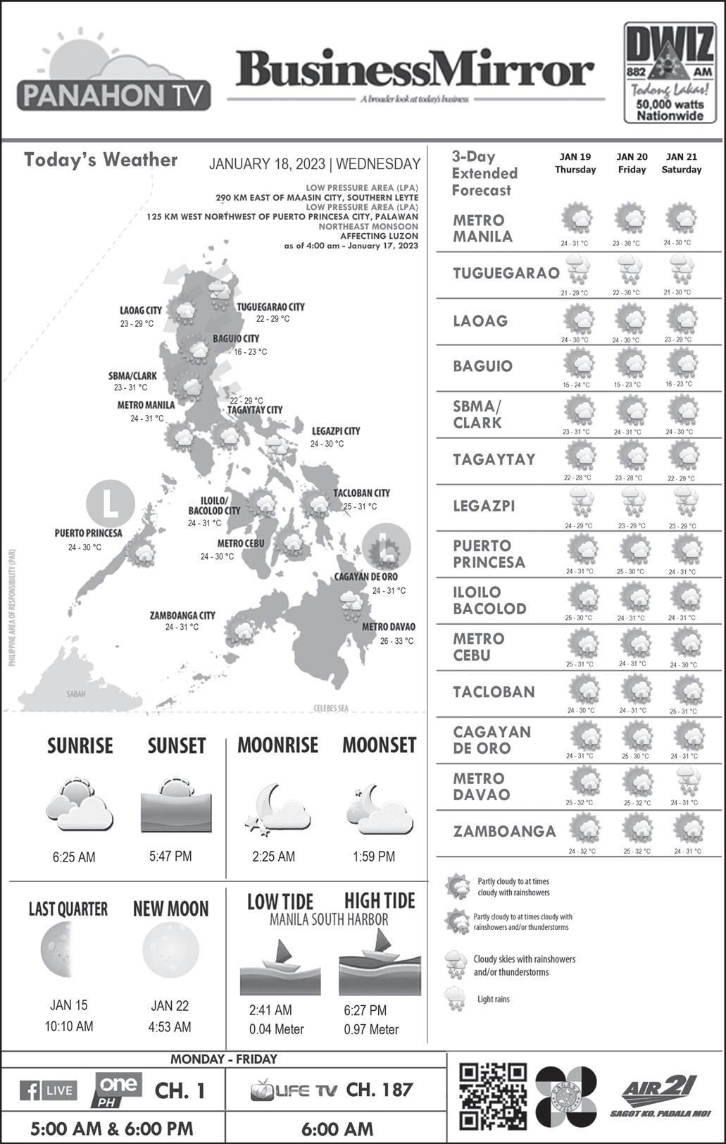 PESO EXCHANGE RATES n US 54.6510 n JAPAN 0.4252 n UK 66.6469 n HK 6.9970 n CHINA 8.1109 n SINGAPORE 41.3709 n AUSTRALIA 38.0043 n EU 59.1324 n KOREA 0.0440 n SAUDI ARABIA 14.5519 Source : BSP(17January2023) A broader look at today’s business BusinessMirror HOLIDAY ECONOMICS NEEDS REVIEW–NEDA ALL THINGS BEING EQUAL...High-rise buildings in Makati’s upscale Rockwell area dwarf shanties in Barangay Viejo along Bernardino Street in the same city in this photo taken Tuesday, January 17, 2023. A report by global NGO Oxfam, unveiled as the World Economic Forum (WEF) was to open in Davos, said inequality had widened across the world, with the richest 1 percent grabbing nearly two-thirds of all new wealth worth $42 trillion created globally since 2020. NONOY LACZA SINGAPORE-BASED AMRO CITES BETTER-THAN-EXPECTED GROWTH PERFORMANCE LAST YEAR www.businessmirror.com.ph P25.00 nationwide | 2 sections 22 pages | 7 DAYS A WEEK