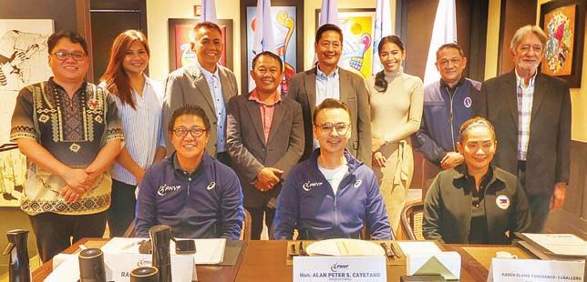 SEN. Alan Peter Cayetano (seated, center) is named chairman emeritus along with president Ramon “Tats” Suzara (seated, left). Also in photo are Philippine Olympic Committee observer Karen Tanchanco Caballero (seated, right) and (standing from left) Karl Chan, Carmela Arcolas Gamboa, Yul Benosa, Dr. Arnel Hajan, Donaldo Caringal, Maria Rosario “Charo” Soriano, Atty. Alfedo Villamor Jr. and Richard “Ricky” Palou.