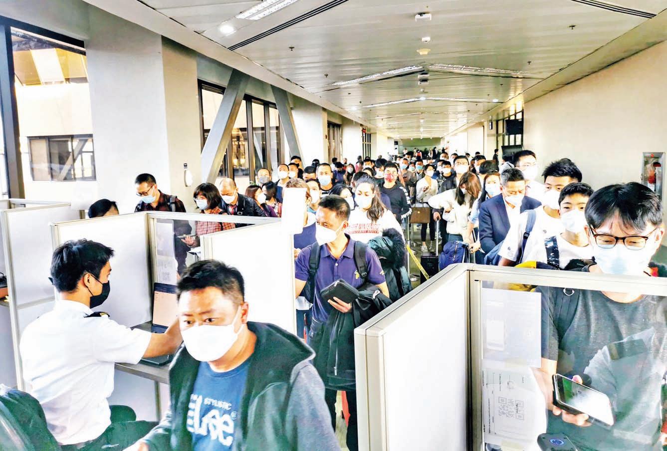 PASSENGERS from Xiamen, China, a key tourist market for the Philippines, are screened by immigration and quarantine officers as they arrive on Tuesday. Officials from the Department of Tourism, the Manila International Airport Authority (MIAA) and the Chinese Embassy in Manila led the welcome for 189 passengers on Xiamen Air flight MF819 which arrived at NAIA 1 from China on Tuesday. NONIE REYES