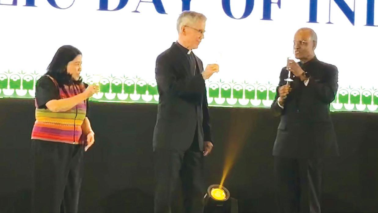 REPUBLIC DAY Ambassador Shri. Harsh Kumar Jain (right) led the ceremonial toast to celebrate the 77th Republic Day of India during the local festivities held on January 26, where lauded the strong bilateral linkages between New Delhi and Manila. He was joined by Undersecretary Maria Theresa B. Dizon-De Vega and Papal Nuncio Archbp. Rev. Charles John Brown DD.