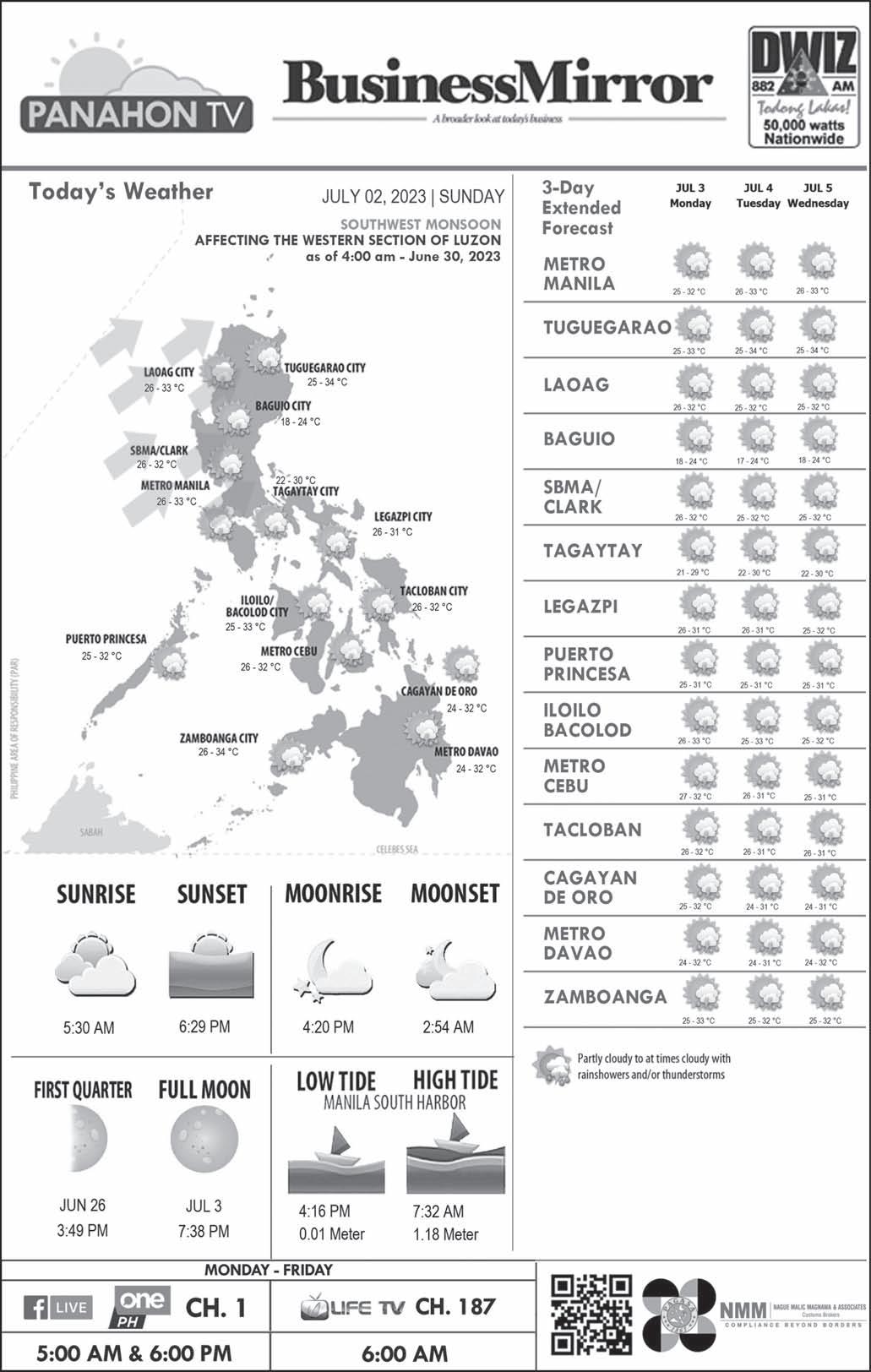 A broader look at today’s business EJAP JOURNALISM AWARDS BUSINESS NEWS SOURCE OF THE YEAR (2017, 2018, 2019, 2020, 2021) DEPARTMENT OF SCIENCE AND TECHNOLOGY 2018 BANTOG MEDIA AWARDS 2006 National Newspaper of the Year 2011 National Newspaper of the Year 2013 Business Newspaper of the Year 2017 Business Newspaper of the Year 2019 Business Newspaper of the Year 2021 Pro Patria Award PHILIPPINE STATISTICS AUTHORITY 2018 Data Champion www.businessmirror.com.ph n Sunday, July 2, 2023 Vol. 18 No. 258 P25.00 nationwide | 2 sections 12 pages | 7 DAYS A WEEK