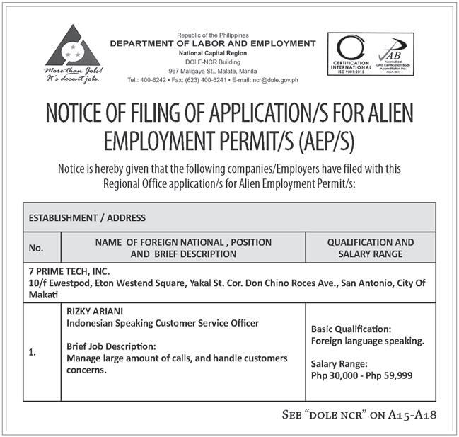 ESTABLISHMENT / ADDRESS No. NAME OF FOREIGN NATIONAL , POSITION AND BRIEF DESCRIPTION QUALIFICATION AND SALARY RANGE ESTABLISHMENT / ADDRESS No. NAME OF FOREIGN NATIONAL , POSITION AND BRIEF DESCRIPTION QUALIFICATION AND SALARY RANGE BusinessMirror A15 www.businessmirror.com.ph Saturday, July 15, 2023 ESTABLISHMENT / ADDRESS No. NAME OF FOREIGN NATIONAL , POSITION AND BRIEF DESCRIPTION QUALIFICATION AND SALARY RANGE 7 PRIME TECH, INC. 10/f Ewestpod, Eton Westend Square, Yakal St. Cor. Don Chino Roces Ave., San Antonio, City Of Makati 1. RIZKY ARIANI Indonesian Speaking Customer Service Officer Brief Job Description: Manage large amount of calls, and handle customers concerns. Basic Qualification: Foreign language speaking. Salary Range: Php 30,000 - Php 59,999 ACCENTURE, INC. 7f, Robinsons Cybergate Tower 1, Pioneer St, City Of Mandaluyong 2. VISWANATHAN, ANAND Service Delivery Ops Associate Manager Brief Job Description: Ensure regional delivery engagement and reporting compliance. Work with business development, contract/legal teams to cross/upsell and ensures change order process is followed. Basic Qualification: College graduate. With at least 3 years of solid Finance/Accounting relevant experience and at least 4 years of Supervisory experience. Salary Range: Php 90,000 - Php 149,999 3. VALLUVAKUDI RAMAMURTHY, VENKATRAMANI Service Delivery Ops Lead Senior Manager Brief Job Description: Assign all work assignments, commit the team to the work, manage the quality of the work and drive the people management activities, automation, innovations, and digitization within the team. Basic Qualification: 8-10 plus years of delivery/ people management experience. Bachelor’s degree. Salary Range: Php 150,000 - Php 499,999 AD POWERPLANT SERVICES OPC Unit 1505 Aic Grande Tower Condominium, Garnet Road, Ortigas Center, San Antonio, City Of Pasig 4. DURAI, ELAVARASI Administrative Manager Brief Job Description: Manage office and site administrative work. Basic Qualification: Knowledge of local government standards. Salary Range: Php 30,000 - Php 59,999 5. ANTONY SAMY, THILIPAN RAJA Equipment Performance And Emission Controller Brief Job Description: Assist in the proper operation the rice husk/rice hull fueled total power plant as per guidelines and as per standard operating practices from the field. Basic Qualification: College graduate. College graduate. With knowledge of Biomass Renewable Energy Cogeneration, Power Plant Technology and operation and maintenance of Electrostatic Precipitator (ESP). Salary Range: Php 60,000 - Php 89,999 AEON CREDIT SERVICE (PHILIPPINES) INC. Unit 301-304, 5th/f Hanston Square Bldg., # 17 San Miguel Ave., Ortigas Center, San Antonio, City Of Pasig 6. SATO, HIROTOSHI Assistant Vice President For Finance Brief Job Description: Directs strategic initiatives and ensures policies and systems are in place to support the development of long-term growth plans and profitability of the Company. Analyzes and reviews the recommendations from different business units regarding Company’s expansion opportunities, investments, internal business performance and improvements, etc. Basic Qualification: Graduate of a Bachelor’s Degree in Accounting or any related course. With at least 7 years of solid senior management experience in credit assessment and collection from financial institutions and related industries. Salary Range: Php 150,000 - Php 499,999 7. KOMATSU, AYATAKA Vice President For Credit Operation Brief Job Description: Directs subordinates (managers) to ensure implementation of processes to improve cash flow and make receivables are achieved at the timeline. Provides guidance and expertise in developing policies regarding the investigation of customers, extension of credit liners and collections. Basic Qualification: Graduate of a Bachelor’s Degree in Business Management or any related course. With at least 7 years of solid senior management experience in credit assessment and collection from financial institutions and related industries. Salary Range: Php 150,000 - Php 499,999 AMAZON OPERATION SERVICES PHILIPPINES, INC. B21 Three E-com Moa Complex, Harbour Drive Cor. Bay Shore, Brgy. 076, Pasay City 8. TRAN THI THU THUY RCO Investigation SP - VN Brief Job Description: Communicates effectively via email and/or telephone with buyers, merchants and internal customers. Basic Qualification: Fluency in Vietnamese. Salary Range: Php 30,000 - Php 59,999 APRICUS TECHNOLOGY INC. 8/f Aguirre Building, 107 Aguirre St. Legaspi Village, San Lorenzo, City Of Makati 9. NGUYEN THUY TRANG Operation Support Officer- Vietnamese Speaking Brief Job Description: Performs onsite operational support including records management and facilitating onsite activities. Basic Qualification: Good communication and presentation skills. Salary Range: Php 30,000 - Php 59,999 AVANTICE CORPORATION 19/f Pbcom Tower, Ayala Ave., Bel-air, City Of Makati 10. BELINDA Client BPO Assistant Manager Brief Job Description: Coordinating with upper management to find ways to enhance their customer service objectives among executives. Basic Qualification: Diploma/certificate. College degree in any field. Fluent in English and Mandarin. Salary Range: Php 150,000 - Php 499,999 11. HENA Client BPO Assistant Manager Brief Job Description: Coordinating with upper management to find ways to enhance their customer service objectives among executives. Basic Qualification: Diploma/certificate. College degree in any field. Fluent in English and Mandarin. Salary Range: Php 150,000 - Php 499,999 12. MARGARETHA Finance Senior Executive Brief Job Description: Creates monthly reports and ensures financial information has been recorded accurately. Basic Qualification: Must be native Cambodian/ Indonesian. Fluent in English and Khmer/Bahasa Indonesian. Salary Range: Php 90,000 - Php 149,999 BLOOMBERRY RESORTS AND HOTELS INC. Solaire Resort And Casino, 1 Asean Avenue, Entertainment City, Tambo, City Of Parañaque 13. KIM, YUJIN Ag