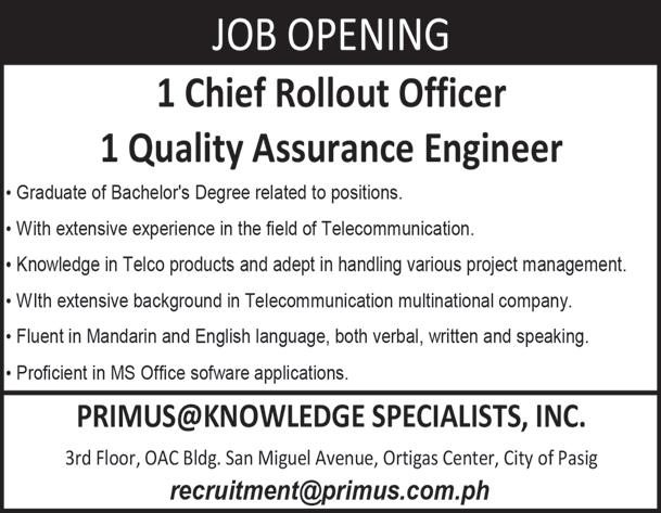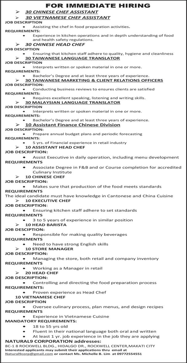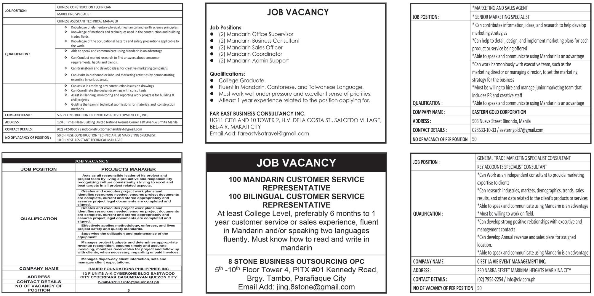 ESTABLISHMENT / ADDRESS No. NAME OF FOREIGN NATIONAL , POSITION AND BRIEF DESCRIPTION QUALIFICATION AND SALARY RANGE ESTABLISHMENT / ADDRESS No. NAME OF FOREIGN NATIONAL POSITION AND BRIEF DESCRIPTION QUALIFICATION AND SALARY RANGE ESTABLISHMENT / ADDRESS No. NAME OF FOREIGN NATIONAL , POSITION AND BRIEF DESCRIPTION QUALIFICATION AND SALARY RANGE BusinessMirror A6 www.businessmirror.com.ph A18 Saturday, July 15, 2023 157. PAN, XIAOMIN Chinese Marketing Staff Brief Job Description: Introduce the company to ship owners/charters / brokers and attend inquiries from these parties. Basic Qualification: College level. Proficient in Chinese-Mandarin language. Salary Range: Php 30,000 - Php 59,999 PH GLOBAL JET EXPRESS INC. 11th Floor, The Marajo Tower, 26th Street Cor. 4th Avenue Bgc, Fort Bonifacio, City Of Taguig 158. MA, LONGZE Mandarin Customer Service Representative Brief Job Description: Serves customers by providing product and service information and resolving product and engaged to provide significant support, through the use of Mandarin native language, to senior professionals in China, Taiwan and other Mandarin speaking counterpart and clients. Basic Qualification: Bachelor degree in Information Technology. Mandarin speaking. Salary Range: Php 60,000 - Php 89,999 159. WU, QUAN Mandarin Customer Service Representative Brief Job Description: Serves customers by providing product and service information and resolving product and engaged to provide significant support. Basic Qualification: Bachelor degree in Information Technology. Salary Range: Php 60,000 - Php 89,999 160. WU, SHIXIONG Mandarin Customer Service Representative Brief Job Description: Serves customers by providing product and service information and resolving product and engaged to provide significant support, through the use of Mandarin native language, to senior professionals in China, Taiwan and other Mandarin speaking counterpart and clients. Basic Qualification: Bachelor degree in Information Technology. Mandarin speaking. Salary Range: Php 60,000 - Php 89,999 161. WEN, XIANJUN Mandarin Fleet Manager Brief Job Description: Purchasing and maintaining vehicles for deliveries and deciding whether to lease or buy vehicles, through the use of Mandarin native language, to senior professionals in China, Taiwan and other Mandarin speaking counterpart and clients. Basic Qualification: Bachelor degree in logistics. Mandarin speaking. Salary Range: Php 60,000 - Php 89,999 162. ZHOU, XIXIAN Mandarin Fleet Manager Brief Job Description: Purchasing and maintaining vehicles for deliveries and deciding whether to lease or buy vehicles, through the use of Mandarin native language, to senior professionals in China, Taiwan and other Mandarin speaking counterpart and clients. Basic Qualification: Bachelor degree in logistics. Mandarin speaking. Salary Range: Php 60,000 - Php 89,999 163. YANG, XINDA Mandarin Network Management Supervisor Brief Job Description: Maintain Contract and monitor Datacenter AC and power and Act as Backup administrator of Veeam backup and recovery by providing analyze system functions and failures to isolate and define problem areas and resolving engaged to provide significant support, through the use of Mandarin native language. Basic Qualification: Bachelor degree in Business Management. Mandarin speaking. Salary Range: Php 60,000 - Php 89,999 164. CHEN, HEZHU Mandarin Regional Manager Brief Job Description: Oversee the operations of multiple office, store or business branches. Guide, train and manage lowerlevel management and supervisors, though the use Mandarin native language, to senior professionals in China, Taiwan and other Mandarin speaking counterpart and clients. Basic Qualification: Bachelor degree in Business. Mandarin speaking. Salary Range: Php 60,000 - Php 89,999 165. SUN, XIAONAN Mandarin Regional Manager Brief Job Description: Oversee the operations of multiple office, store or business branches. Guide, train and manage lowerlevel management and supervisors, though the use Mandarin native language, to senior professionals in China, Taiwan and other Mandarin speaking counterpart and clients. Basic Qualification: Bachelor degree in Business. Mandarin speaking. Salary Range: Php 60,000 - Php 89,999 166. WANG, HUIJUN Mandarin Regional Manager Brief Job Description: Oversee the operations of multiple office, store or business branches. Guide, train and manage lowerlevel management and supervisors, though the use Mandarin native language, to senior professionals in China, Taiwan and other Mandarin speaking counterpart and clients. Basic Qualification: Bachelor degree in Business. Mandarin speaking. Salary Range: Php 60,000 - Php 89,999 167. YANG, JIN Mandarin Regional Manager Brief Job Description: Oversee the operations of multiple office, store or business branches. Guide, train and manage lowerlevel management and supervisors, though the use Mandarin native language, to senior professionals in China, Taiwan and other Mandarin speaking counterpart and clients. Basic Qualification: Bachelor degree in Business. Mandarin speaking. Salary Range: Php 60,000 - Php 89,999 PHESCO, INCORPORATED 491-495, Quezon Ave., Santo Domingo, Quezon City 168. YOON, YOUNGDAE Supervisor - Operations Relations Brief Job Description: Provides supervision and guidance to the operational activities of the operations group. Basic Qualification: Solid negotiating skills, ideally with a history of dealing with foreign government authorities and private entities, consultants, general contractors and materials suppliers. With experience in foreign private construction contracts. Salary Range: Php 30,000 - Php 59,999 PHILIPPINE PLAZA HOLDINGS, INCORPORATED Ccp Complex, Roxas Blvd., Barangay 76, Pasay City 169. GROVES, LUKE JAMES Resident Manager Brief Job Description: Responsible for the entire Hotel operation such as financial results of the hotel and for the standards of the product, service, management of human resources and the 