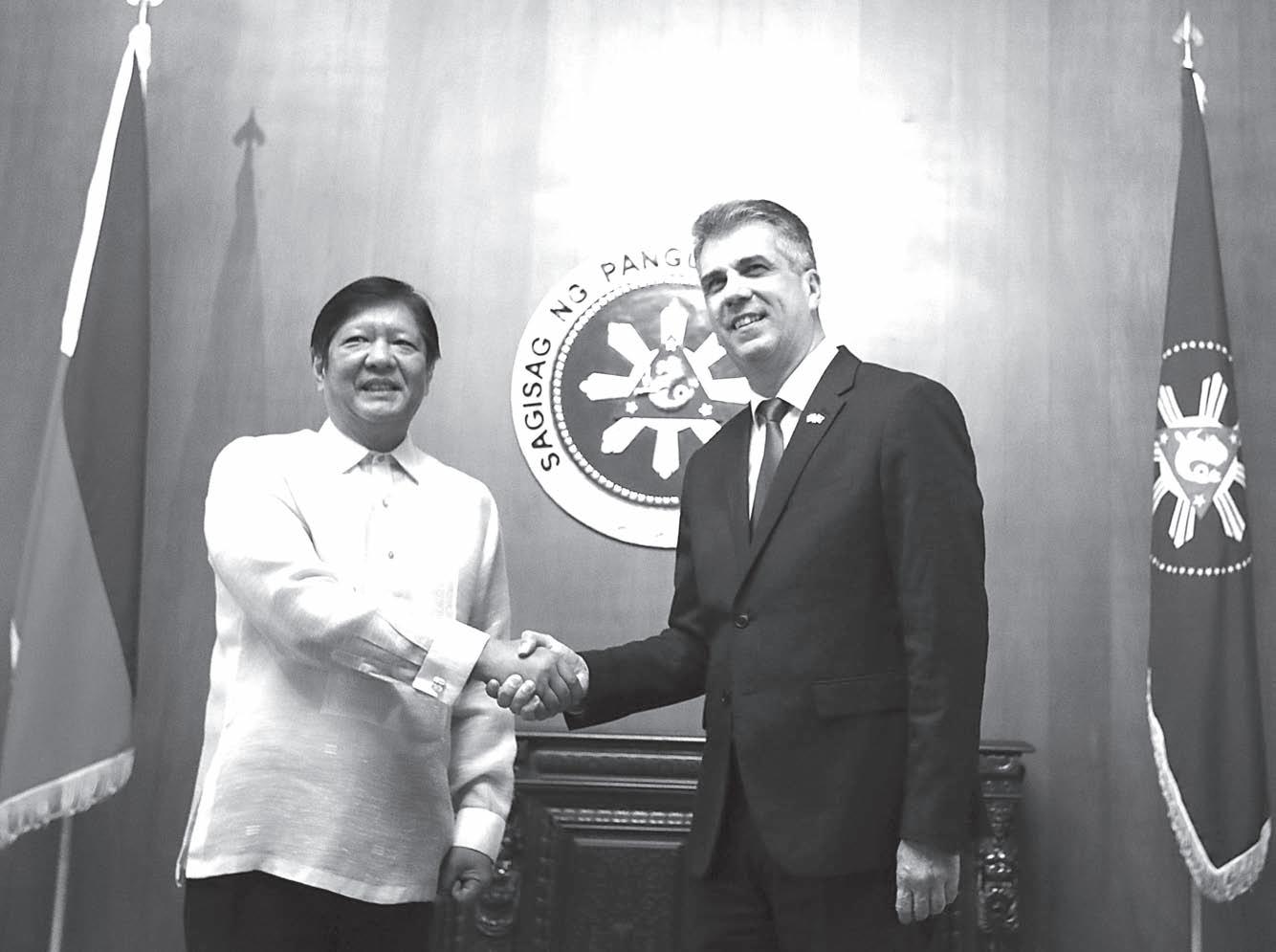 PRESIDENT Ferdinand R. Marcos Jr. warmly receives Israeli Foreign Minister Eli Cohen at Malacañang Palace, Monday, June 5, 2023. Prior to their meeting, Minister Cohen held a bilateral discussion with Foreign Affairs Secretary Enrique Manalo at the Manila Hotel. This historic visit marks the first time an Israeli foreign minister has set foot in the Philippines since 1967. JOEY RAZON/PNA
