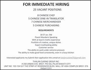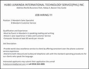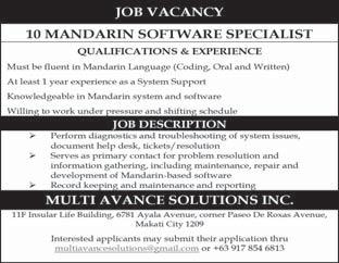 Chinese Mechanical Specialist is who installs, maintains, repairs, and troubleshoots various types of mechanical equipment and systems. Must have good problemable to work with minimum supervision. Php 30,000 - Php 59,999