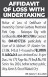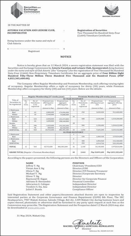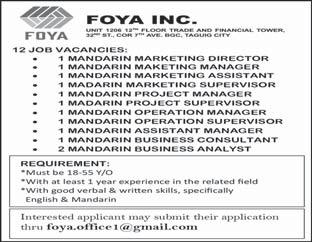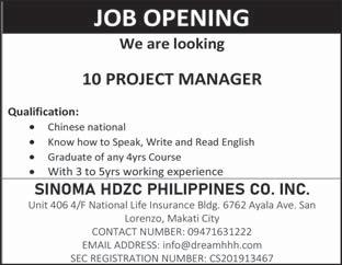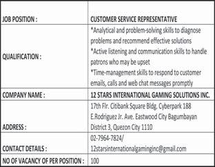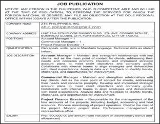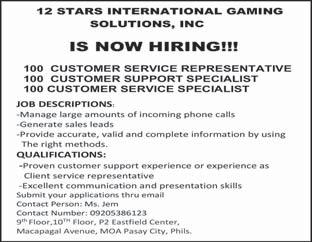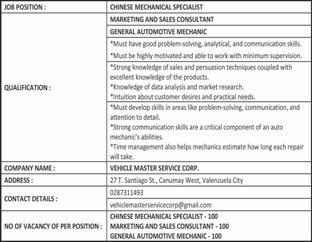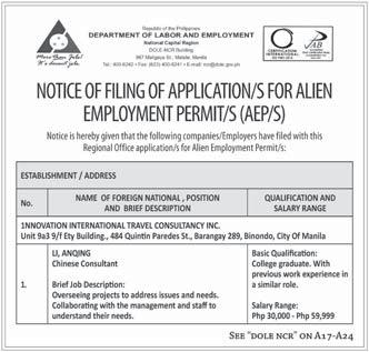 each repair will take. Php 30,000 - Php 59,999 379. CHEN, JIANGHUA trucks and vans. Must develop skills in areas like problem-solving, Time management also helps long each repair will take. Php 30,000 - Php 59,999 380. DU, YOUYI trucks and vans. Must develop skills in areas like problem-solving, Time management also helps long each repair will take. Php 30,000 - Php 59,999 381. MA, TIANLONG trucks and vans. Must develop skills in areas like problem-solving, Time management also helps long each repair will take. Php 30,000 - Php 59,999 382. QIU, YOUJUN trucks and vans. Must develop skills in areas like problem-solving, Time management also helps long each repair will take. Php 30,000 - Php 59,999 383. QIU, ZONGQIAN trucks and vans. Must develop skills in areas like problem-solving, Time management also helps long each repair will take. Php 30,000 - Php 59,999 XIN, YUANYUAN trucks and vans. Must develop skills in areas like problem-solving, Time management also helps long each repair will take. Php 30,000 - Php 59,999 385. ZHONG, XUEFAN trucks and vans. Must develop skills in areas like problem-solving, Time management also helps long each repair will take. Php 30,000 - Php 59,999 386. BUI NGOC ANH Strong knowledge of sales and persuasion techniques coupled with excellent knowledge of the products. Knowledge of data analysis and market research. Php 30,000 - Php 59,999 387. LIU, ZIWEI Strong knowledge of sales and persuasion techniques coupled with excellent knowledge of the products. Knowledge of data analysis and market research. Php 30,000 - Php 59,999 388. SHI, SHUANGLIANG Strong knowledge of sales and persuasion techniques coupled with excellent knowledge of the products. Knowledge of data analysis and market research. Php 30,000 - Php 59,999 389. WANG, XIAODAN Strong knowledge of sales and persuasion techniques coupled with excellent knowledge of the products. Knowledge of data analysis and market research. Php 30,000 - Php 59,999 390. ZHANG, SUZHEN Strong knowledge of sales and persuasion techniques coupled with excellent knowledge of the products. Knowledge of data analysis and market research. Php 30,000 - Php 59,999 391. ZHAO, ZONGZHEN Strong knowledge of sales and persuasion techniques coupled with excellent knowledge of the products. Knowledge of data analysis and market research. Php 30,000 - Php 59,999 WANFANG TECHNOLOGY MANAGEMENT, INC. 6-9/f Tower 2 Double Dragon Plaza, Edsa Cor. Macapagal Ave., Barangay 76, Pasay City 392. NORARAT, RABIL applied for. Php 30,000 - Php 59,999 WORLDCOMPASS DESTINATIONS INC. 393. ZENG, MINGWEI Mandarin Travel Consultant in English and MandarinChinese languages. Strong public speaking skills. Php 30,000 - Php 59,999 Any person in the Philippines who is competent, able and willing to perform the services for BusinessMirror A24 www.businessmirror.com.ph Saturday, June 8, 2024