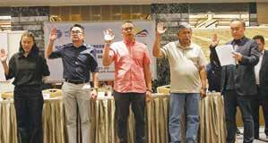 PHILIPPINE Olympic Committee President Rep. Abraham “Bambol” Tolentino administers the oath of office to (from left) Marie Dimanche, Michael Vargas, Rep. Eric Buhain and Jessi Arriola.