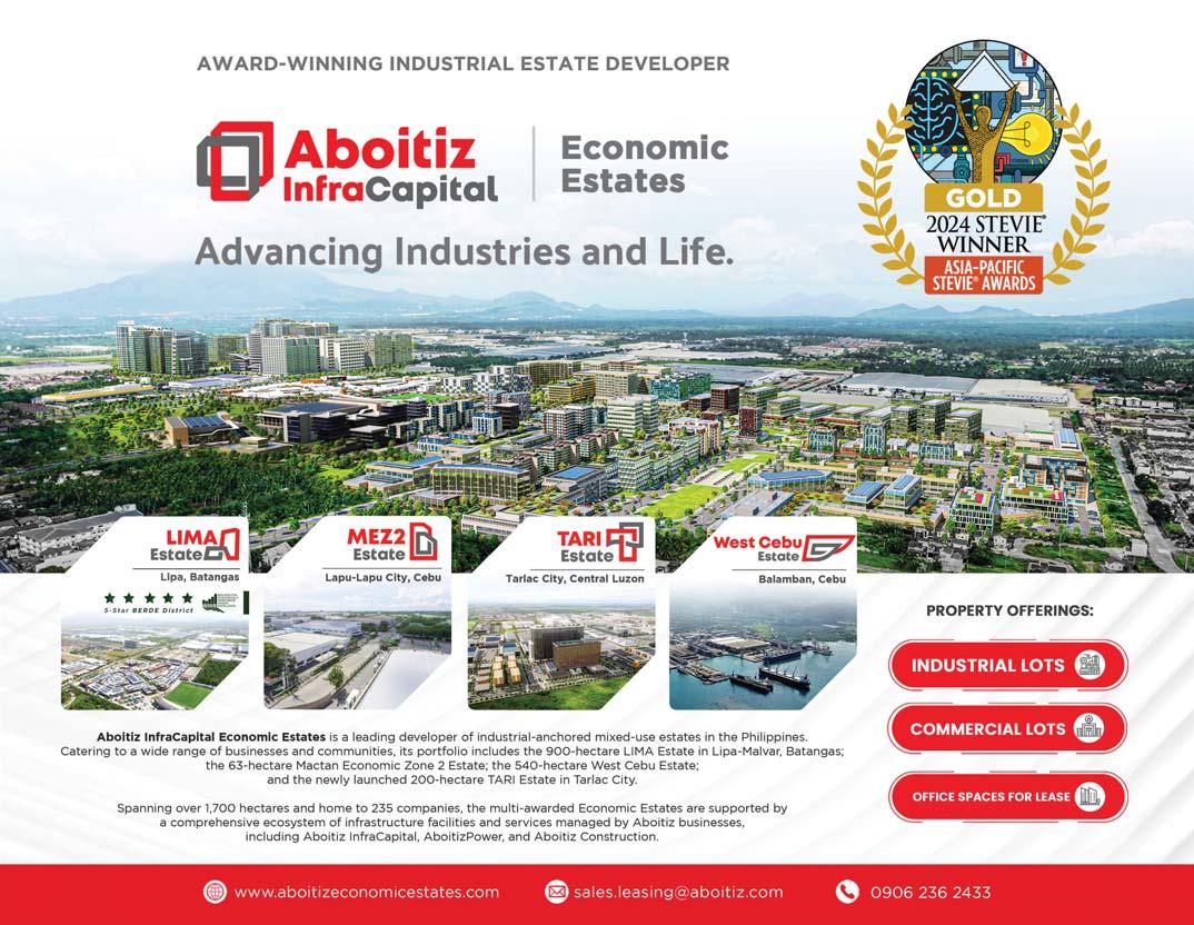 on Facebook and Instagram, and @nwresorts on Twitter. Make the most of your visit and sign up for an Epic Membership or download the Newport World Resorts Mobile App for free at the Apple App Store and Google Play Store. An epic culinary experience from Newport World Resorts awaits n Hotel Okura Manila s Japanese fine din ng restaurant Yamazato. Newport Wor d Resorts presents an exclusive one-night concert David Foster and Friends on June 19. ABOITIZ InfraCapital Economic Estates (AIC Economic Estates), the eader in developing smart and sustainable industrial estates in the Philippines and Asia secured a double victory at the prestigious Asia-Pacific Stevie® Awards These Gold awards recognize AIC s unwavering commitment to green development and solidify their position as a key p ayer in transforming industria andscapes across the region With a 30-year legacy, AIC Economic Estates has become a trusted driver of progress in the Phi ippines The Gold Stevie® Award for Sustainable Business Model high ights their dedication to economic growth a ongside envronmental stewardship This commitment is evident across their flagship deve opments: LIMA Estate MEZ2 Estate, and West Cebu Estate Most recently, they've brought their expertise to Tarlac with the aunch of TAR Estate "We take a ho istic approach balancing economic progress with techno ogica innovation and environmental responsibility," says Rafael Fernandez de Mesa, Head of AIC Economic Estates "We aim to set a new standard for sustainab e industrial estate development creating a brighter future for generations to come AIC Economic Estates' achievements are driven by transformative mi estones and innovative initiatives across their developments A prime examp e is LIMA Estate, which recently received the prestigious 5-star BERDE District Certification from the Philippine Green Building Counci This recognition marks a significant shift towards sustainab e and intelligent growth in the Philippines LIMA Estate exemp ifies this approach, thriving as a vibrant and inc usive community with over 170 companies, 66 000 employees, and 4,000 households It stands as a testament to the successful integration of sustainabi ity with economic prosperity The Gold Stevie Award for Video Innovation underscores their excellence in communication and fostering strategic partnerships AIC Economic Estates cohesive brand approach reinforces their commitment to driving transformation in both the business andscape and the communities they serve nationwide "Our impact extends beyond infrastructure deve opment," says Fernandez de Mesa With over 100 000 jobs created across Central Visayas and Southern Luzon we active y promote economic empowerment and improve ive ihoods " The double Gold wins at the Asia-Pacific Stevie® Awards solidify Aboitiz InfraCapital Estates' position as a leader in sustainab e urban deve opment and infrastructure innovation As they continue their journey, they remain dedicated to fostering economic growth, building thriving communities, and creating a lasting positive impact Green champion: Aboitiz gets double Gold for sustainability and innovation Awards debut Aboit z InfraCapita Economic Estates, led by ts head Rafael Fernandez de Mesa (left), receives first ever Asia-Pacific Stevie Awards with a doub e go d recognition The 900-hectare Lima Estate in Malvar, Batangas is the country s first and largest five-star BERDE-District Certified industrial-anchored development The Gold Stevie Award for Video Innovation underscores their excellence in communication and fostering strategic partnerships.