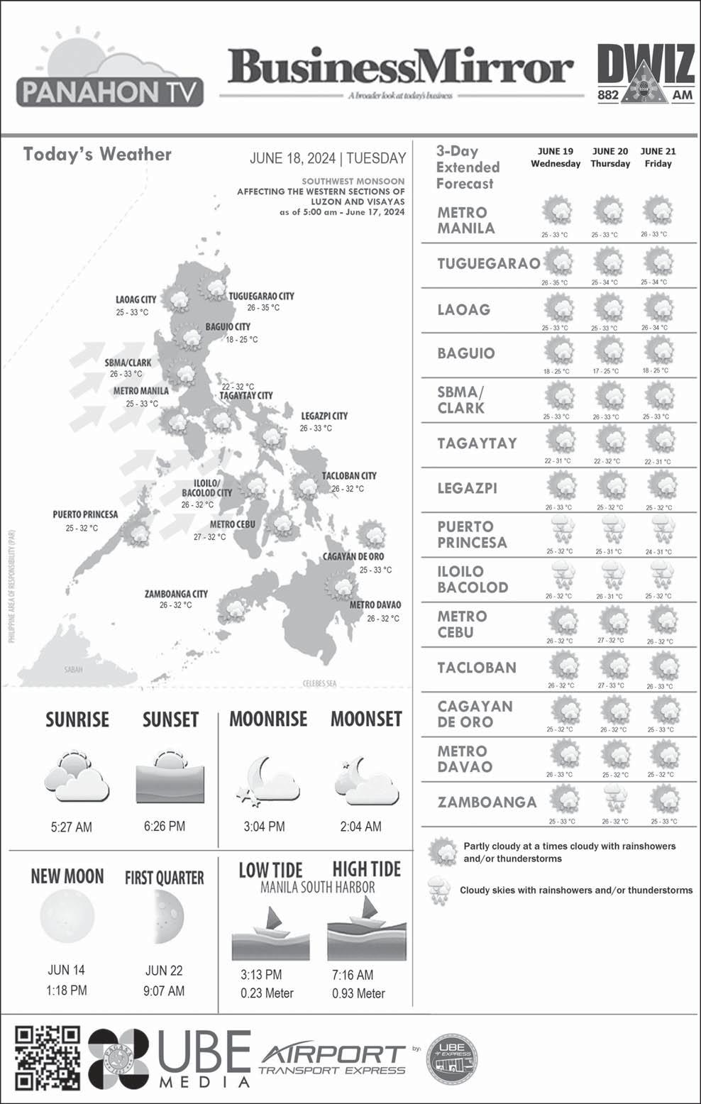 UP 3.1% TO $2.56B–BSP w P. nationwide | sections pages | Tuesday, June 18, 2024 Vol. 19 No. 245 BusinessMirror ROTARY CLUB OF MANILA JOURNALISM AWARDS 2006 National Newspaper of the Year 2011 National Newspaper of the Year 2013 Business Newspaper of the Year 2017 Business Newspaper of the Year 2019 Business Newspaper of the Year 2021 Pro Patria Award PHILIPPINE STATISTICS AUTHORITY 2018 Data Champion EJAP JOURNALISM AWARDS BUSINESS NEWS SOURCE OF THE YEAR 2017, 2018, 2019, 2020, 2021 DEPARTMENT OF SCIENCE AND TECHNOLOGY 2018 BANTOG MEDIA AWARDS