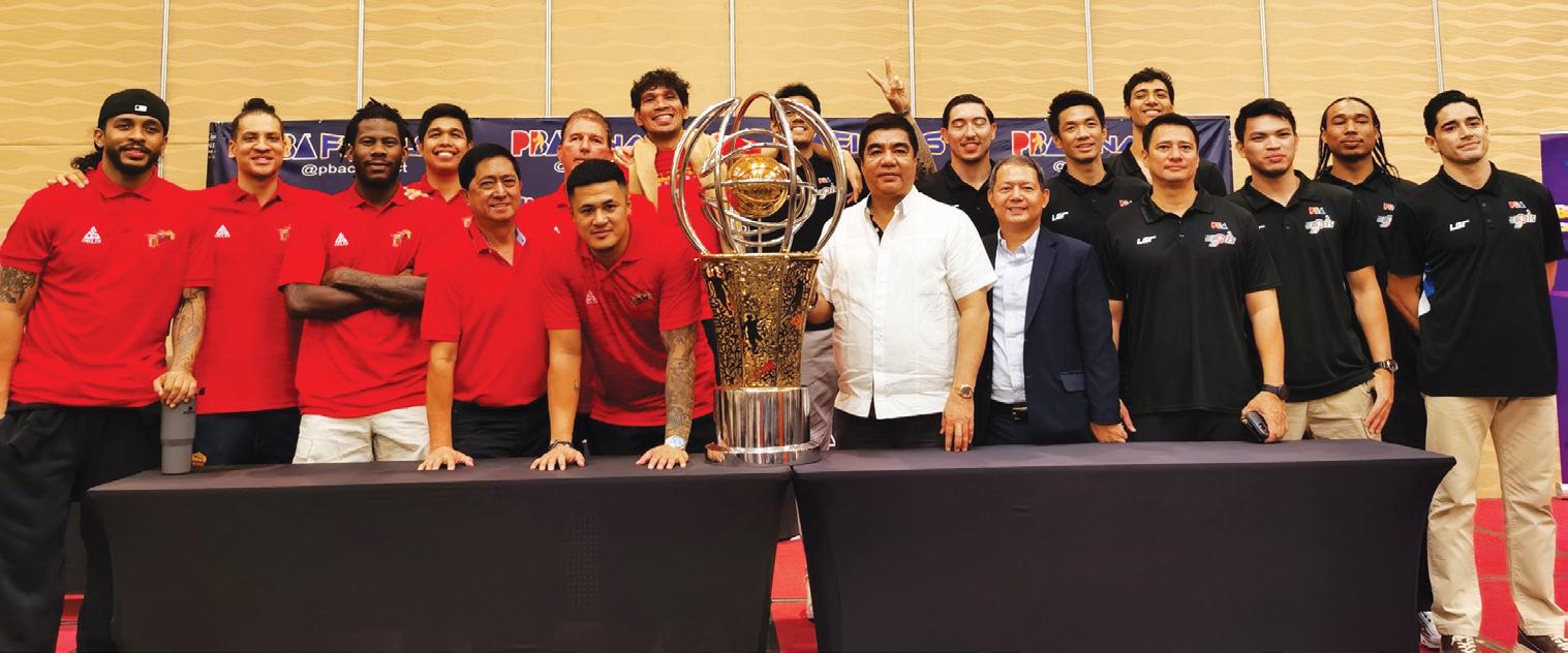 THE protagonists in the Philippine Cup Finals with Commissioner Willie Marcial and governors Robert Non (San Miguel Beer) and Atty. Bill Pamintuana (Meralco) during Monday’s press conference ahead of the series with Game 1 of the race-to-four championship set 7:30 p.m. Wednesday at the Smart Araneta Coliseum.
