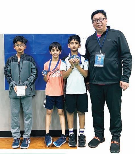COACH ALLAN SHINES Allan de Leon (right) poses with (from left) Neel Ganesh, Bivab Chandra and Sai Ratan, whom the former Philippine Badminton Asso ciation and national coach has been handling since he moved to the US in September 2019. Now the Atlanta Badminton Club head coach, de Leon continues to develop and train future world-caliber players. Shankar and Liu, both 9 years old and ranked among the top 10 in the US Badminton Association, won the mixed doubles under-11 title in the Arena SoCal Open Regional Championships in Pomona, California, recently. Shankar also bagged the boys’ doubles trophy with Aditya Namboodiripad.