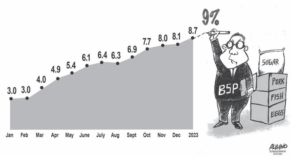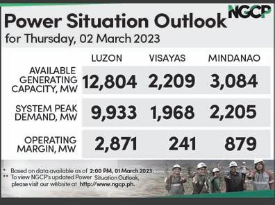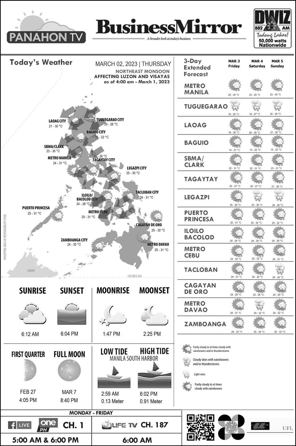 PESO EXCHANGE RATES US 55.2100 ■ JAPAN 0.4054 ■ UK 66.3845 ■ HK 7.0339 ■ SINGAPORE 40.9539 ■ AUSTRALIA 37.1453 ■ SAUDI ARABIA 14.7129 ■ EU 58.4122 ■ KOREA 0.0417 ■ CHINA 7.9628 Source: BSP (March 1, 2023) S “B,” A BusinessMirror A broader look at today’s business www.businessmirror.com.ph P. | | 7 DAYS A WEEK ■ Thursday, March 2, 2023 Vol. 18 No. 138 ROTARY CLUB OF MANILA JOURNALISM AWARDS 2006 National Newspaper of the Year 2011 National Newspaper of the Year 2013 Business Newspaper of the Year 2017 Business Newspaper of the Year 2019 Business Newspaper of the Year 2021 Pro Patria Award PHILIPPINE STATISTICS AUTHORITY 2018 Data Champion EJAP JOURNALISM AWARDS BUSINESS NEWS SOURCE OF THE YEAR (2017, 2018, 2019, 2020) DEPARTMENT OF SCIENCE AND TECHNOLOGY 2018 BANTOG MEDIA AWARDS BUDGET DEFICIT FALLS 3.35% TO P1.614T IN ’22 MEGA PLANT President Ferdinand Marcos Jr. and William Tiu Lim, Mega Global Corp. CEO, lead the ceremonial ribbon-cutting for the opening of the 35,818-square-meter food manufacturing plant on Maharlika Highway, Barangay San Antonio, Santo Tomas, Batangas, on Wed Gov. Hermilando Mandanas, Trade Secretary Alfredo Pascual and Mega Global Corp. COO Michelle Tiu Lim. President Marcos Jr. said the addition of the Mega Manufacturing Plant in Santo Tomas, Batangas, will help the government attain a 10-percent annual in operational, the plant is expected to create over 1,000 jobs and livelihood opportunities. Story in Companies, B1. NONIE REYES Marcos, Anwar tackle trade, investment, security issues MARCOS: NO NEED FOR SPECIAL POWERS FOR ME C A S “M,” A PHL manufacturing PMI slips to 52.7 in Feb S “PHL,” A FIERY GREECE TRAIN COLLISION KILLS 26, INJURES AT LEAST 85 THE WORLD »A10 B J E Y. A @jearcalas