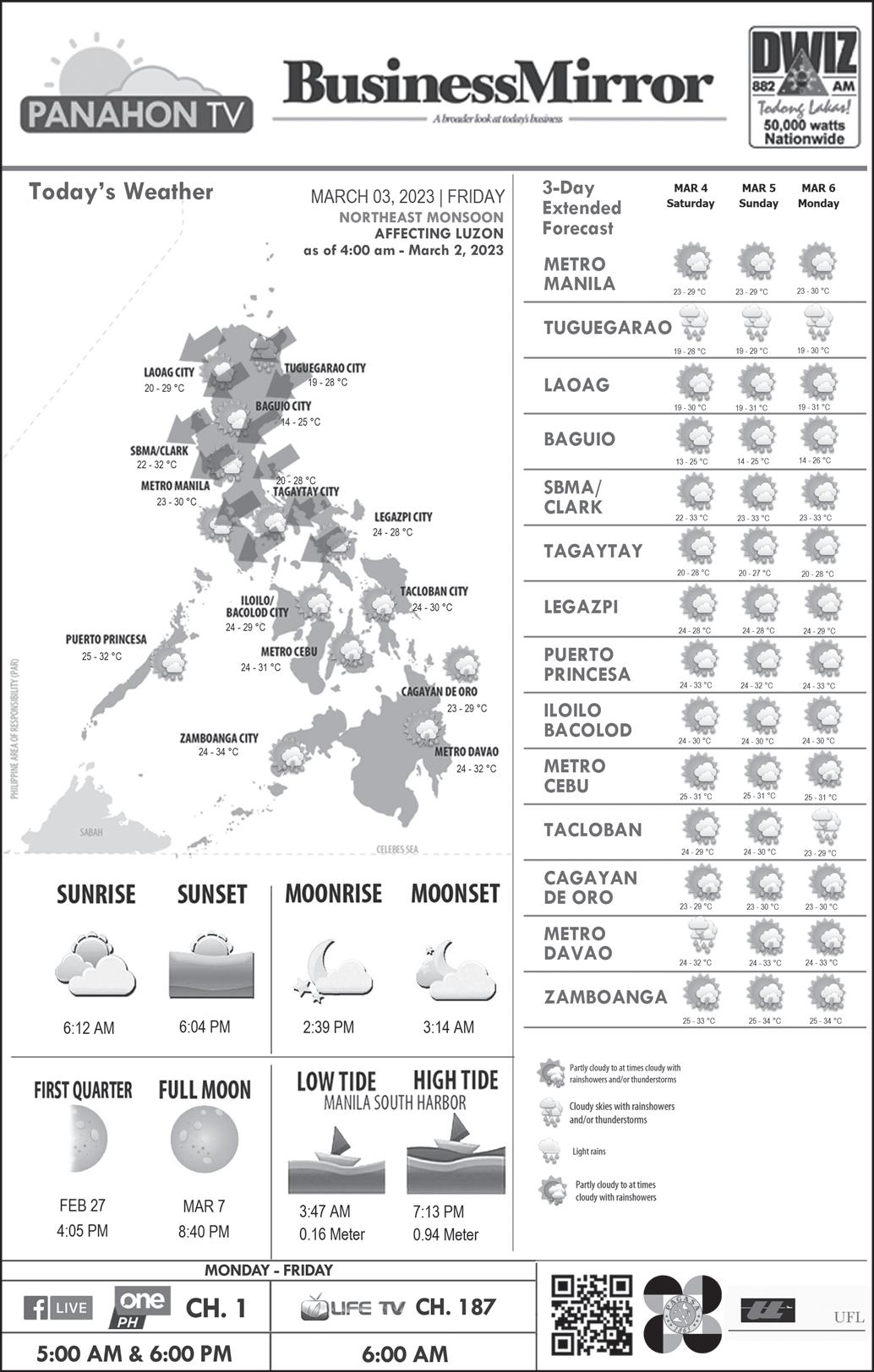 PESO E xchangE ratES n US 55.0770 n jaPan 0.4045 n UK 66.2852 n hK 7.0167 n chIna 8.0136 n SIngaP OrE 41.0502 n aUStralIa 37.2376 n EU 58.7617 n KOrE a 0.0422 n SaUDI arabIa 14.6778 Source: BSP (March 2, 2023) INDEFINITE EXTENSION OF PUV DEADLINE URGED A broader look at today’s business www.businessmirror.com.ph n Friday, March 3, 2023 Vol. 18 No. 139 P25.00 nationwide | 3 sections 24 pages | 7 days a week BusinessMirror 2006 National Newspaper of the Year 2011 National Newspaper of the Year 2013 Business Newspaper of the Year 2017 Business Newspaper of the Year 2019 Business Newspaper of the Year 2021 Pro Patria Award PHILIPPINE STATISTICS AUTHORITY 2018 Data Champion EJAP JOURNALISM AWARDS BUSINESS NEWS SOURCE OF THE YEAR (2017, 2018, 2019, 2020, 2021) DEPARTMENT OF SCIENCE AND TECHNOLOGY 2018 BANTOG MEDIA AWARDS Think tank sees PHL raising rates further by 50 bps