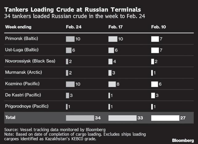 A TOTAL of 34 tankers loaded 25.4 million barrels of Russian crude in the week to Feb. 24, vessel-tracking data and port agent reports show. That’s up by 250,000 barrels, or 1 percent, from the previous week and the highest volume in five weeks. Destinations are based on where vessels signal they are heading at the time of writing, and some will almost certainly change as voyages progress. All figures exclude cargoes identified as Kazakhstan’s KEBCO grade.